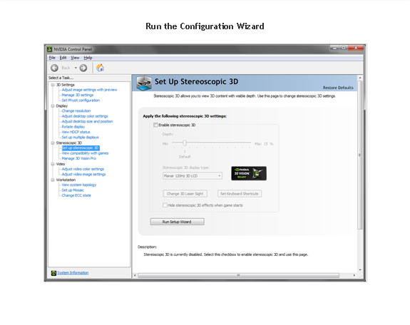 1. Run the Configuration Wizard Launch the Setup Wizard from the 3D Stereoscopic entry in the NVIDIA Control Panel.
