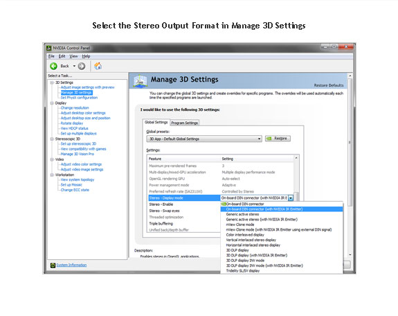 2. Select the Stereo Output Format in Manage 3D Settings. Select the correct output format for your device.