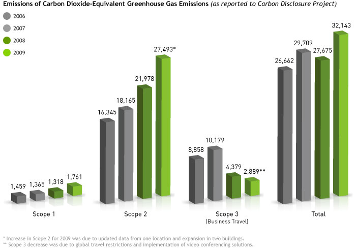 We are working to better understand our environmental impacts so that we can reduce them. For example, we have been reporting our greenhouse gas (GHG) emissions annually to the Carbon Disclosure Project (CDP) since 2007. And as a partner of the Environmental Protection Agency’s Climate Leaders Program, we track the energy usage of our U.S. offices.