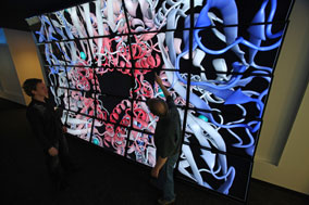 The 3D display wall at CAMI supports visualizations including MRI, whole-body bioluminescence and fluorescence imaging, photon microscopy and scanning probe microscopy of live cells, and allows researchers to visualize data in real time while studying molecular, cellular and tissue structures and interactions.