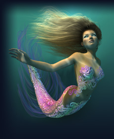 | Nalu [Hawaiian for wave], daughter of the deep sea, stops to admire a creature of the deep as it ascends towards the water's surface. The NVIDIA® GeForce™ 6800 GPUs deliver brute strength to render the soft shading of her long hair and the soft shadows on her skin. |  |