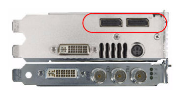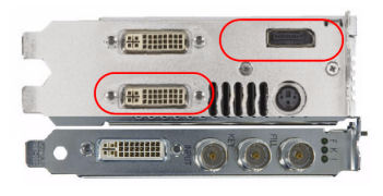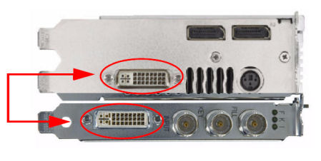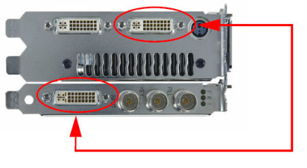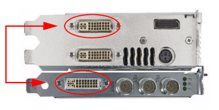 将 DVI 缆线的一端连接到 SDI 输出卡上的 DVI 连接器,另一端连接到 NVIDIA Quadro FX 4600/5600 卡上的“北端”DVI 连接器,如图所示。如果没有缆线连接到这两个连接器上,SDI 输出将无法进行。