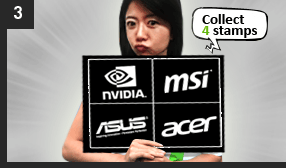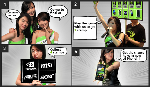 In Computex 2011, come to NVIDIA partners' booths, find a lovely NVIDIA showgril, play the "matching" game to collect one stamp. Collect 4 stamps, and return to NVIDIA to join the stage program, a brand new LG smartphone might be yours!