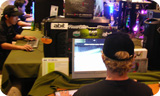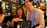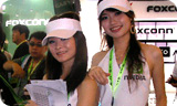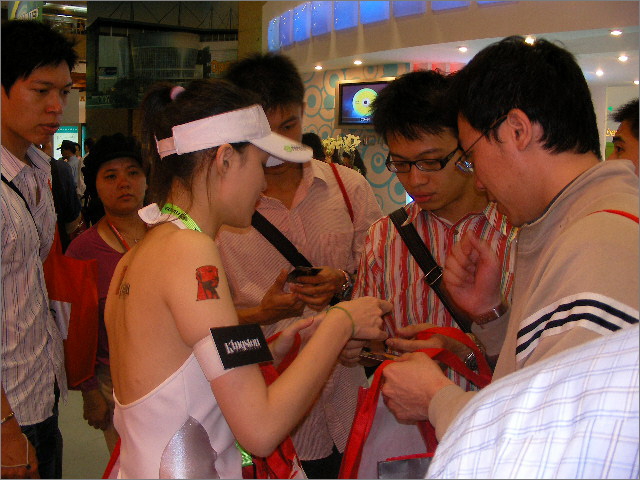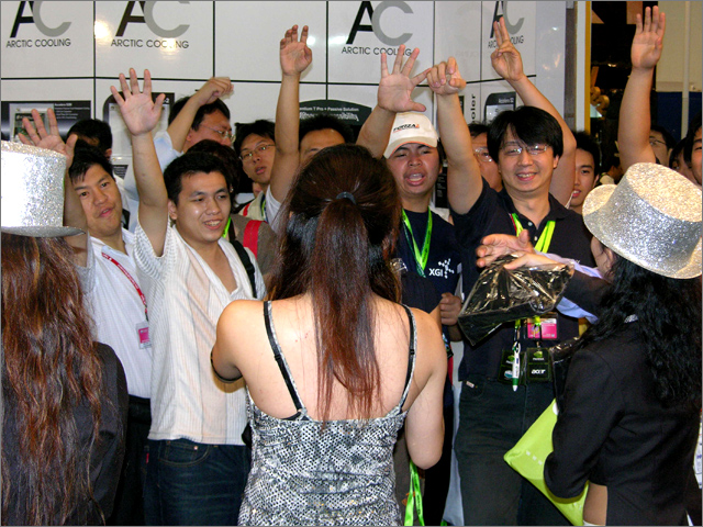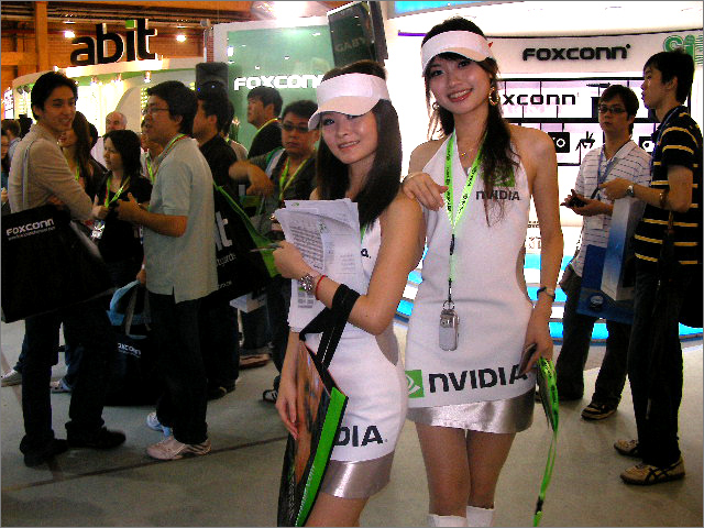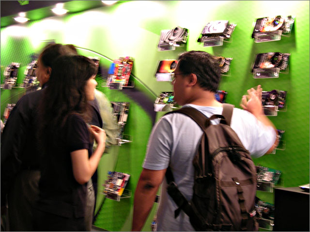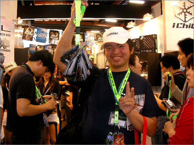 Exchanging cards.   Start taking part in the game by collecting a lanyard from these NVIDIA babes.   So many cards .   Play hard on the XFX express.