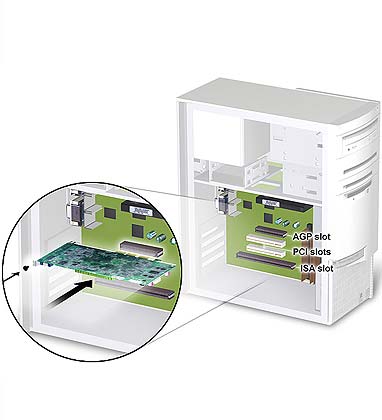 Most computers have a combination of AGP, PCI and ISA expansion slots. AGP slots are usually made from plastic of a contrasting brown color (beige color), and are shorter than other slots in your computer. PCI slots are usually white in color. Install your PCI card into the topmost open white slot. Your system manual should identify the AGP or PCI slots, as appropriate for your model.