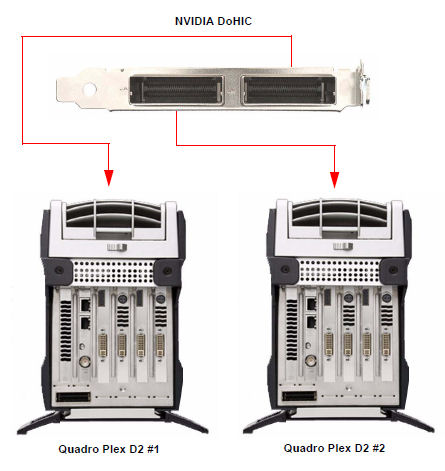 Para utilizar más de cuatro pantallas, necesitará dos unidades Quadro Plex D2 conectadas a una tarjeta NVIDIA Dual Output HIC (DoHIC) instalada en su sistema principal.