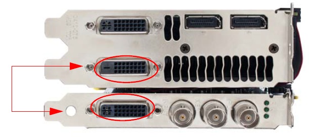 Sluit zoals afgebeeld één uiteinde van de DVI-kabel aan op de DVI-aansluiting op de SDI-uitvoerkaart, en het andere uiteinde op de DVI-aansluiting op de NVIDIA Quadro SDI-kaart. De SDI-uitvoer werkt niet wanneer de kabel niet op deze twee aansluitingen is aangesloten.