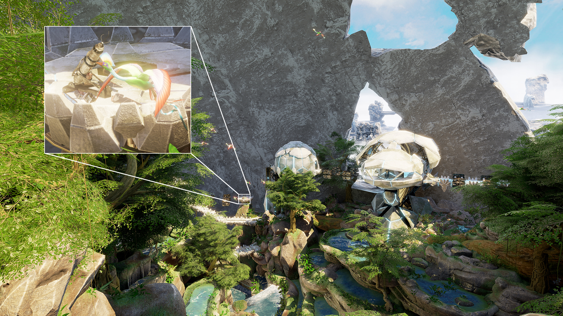 Dank der Leistungsstärke des GeForce GTX-Grafikprozessors können wir Photo Mode-Screenshots mit „Super Resolutions“ wie 63.360 x 35.640 erfassen. Diese Auflösung ist bis zu 33-mal höher als 1.920 x 1.080, der am häufigsten verwendeten Spieleauflösung. Mit dieser Auflösung erfasste Screenshots sind extrem detailliert, und beim Vergrößern wird auch für die kleinsten Objekte die Definition beibehalten. Außerdem wird durch das Aktivieren von Photo Mode in Obduction der Detailgrad erhöht, um Bilder mit der bestmöglichen Qualität zu erstellen.