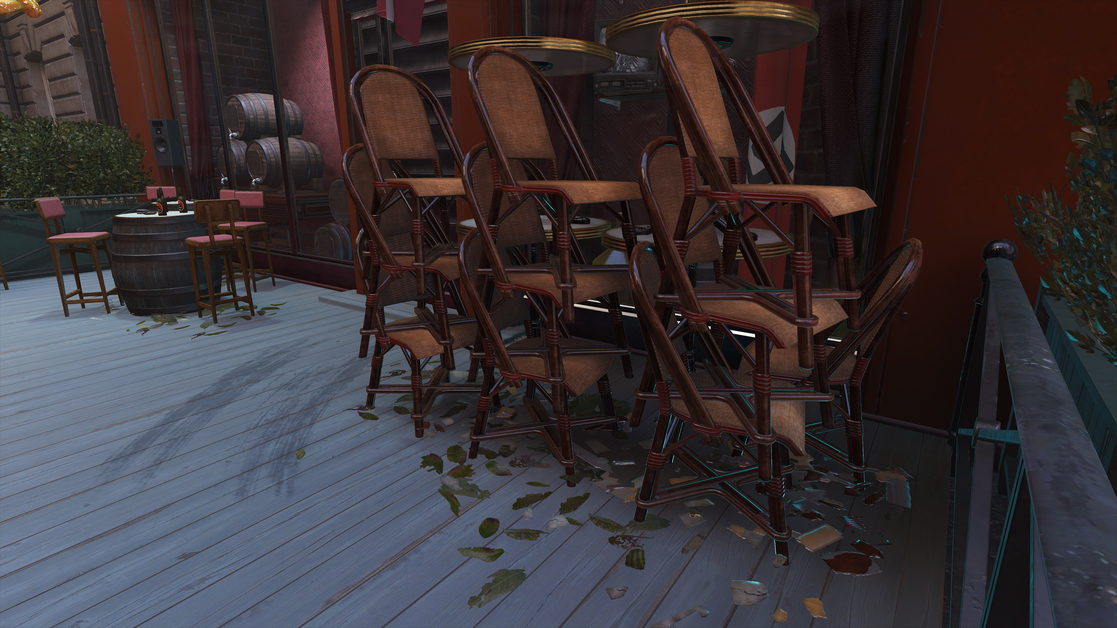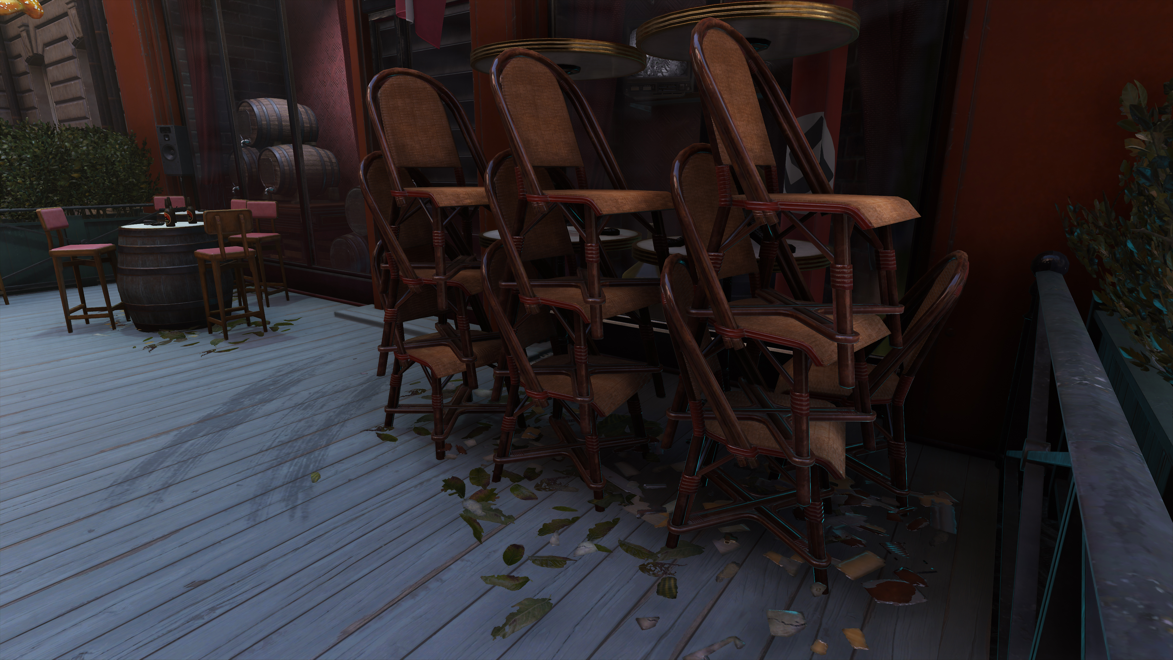 On lower detail levels, the quality of select textures begins to be reduced. In our example below, the quality of the statue and gambling table are greatly reduced; the advertising poster isn't as detailed or as sharp; the road texture is slightly blurrier; and the quality of the textures on geometry and debris is microscopically lower.