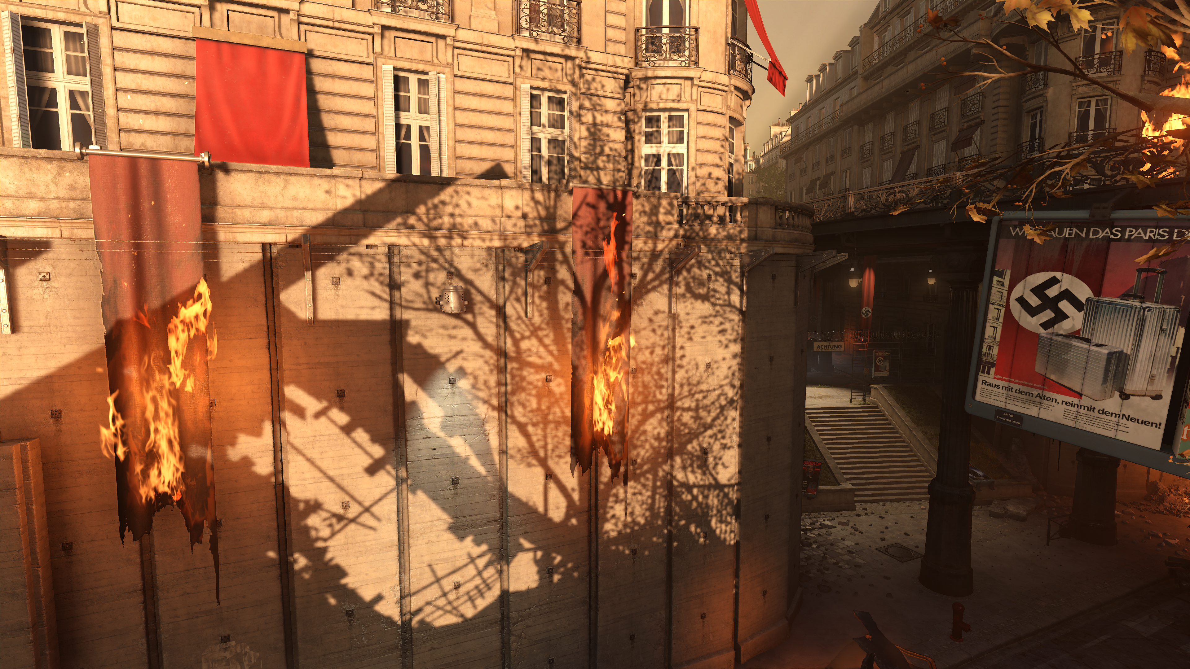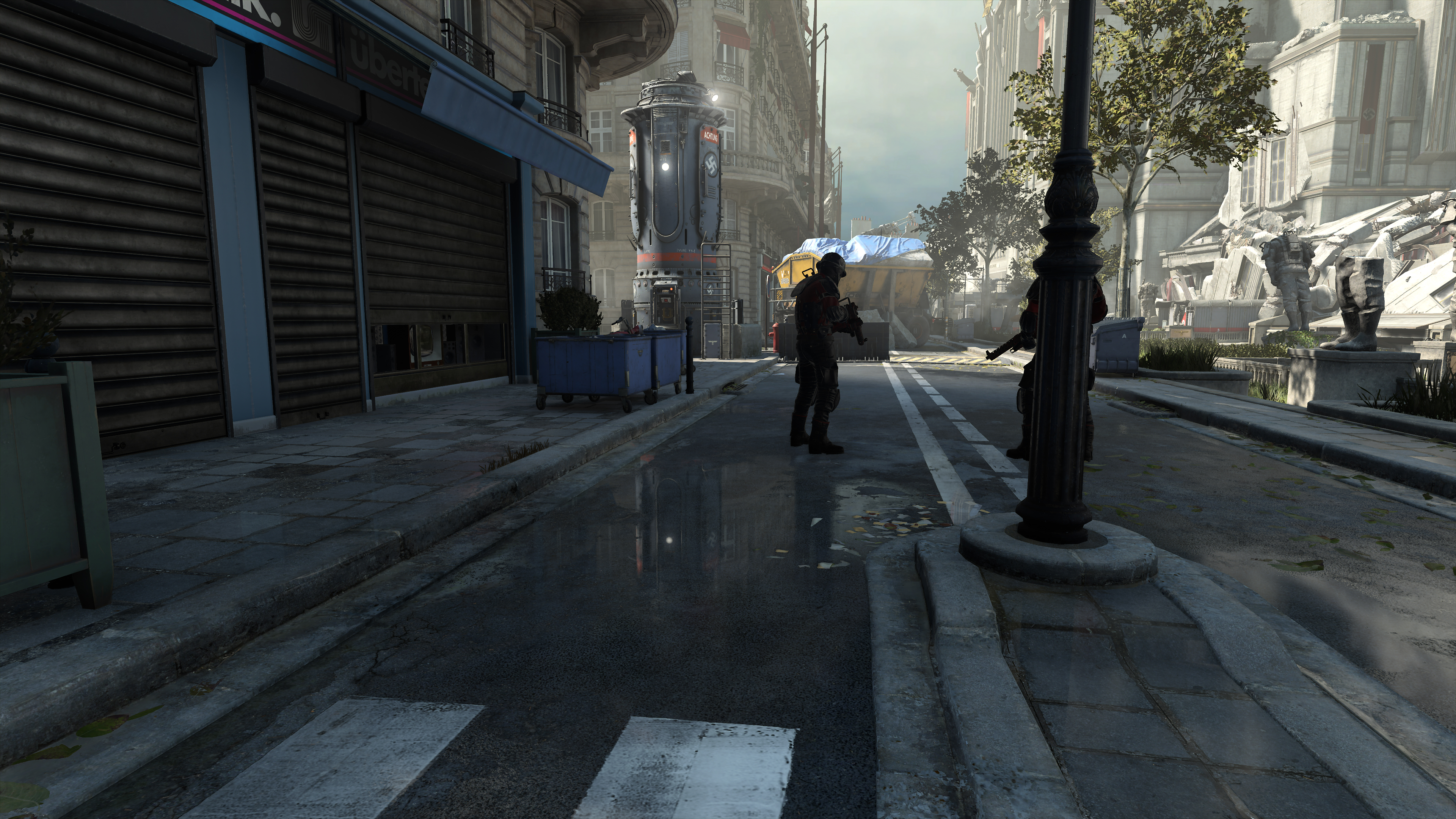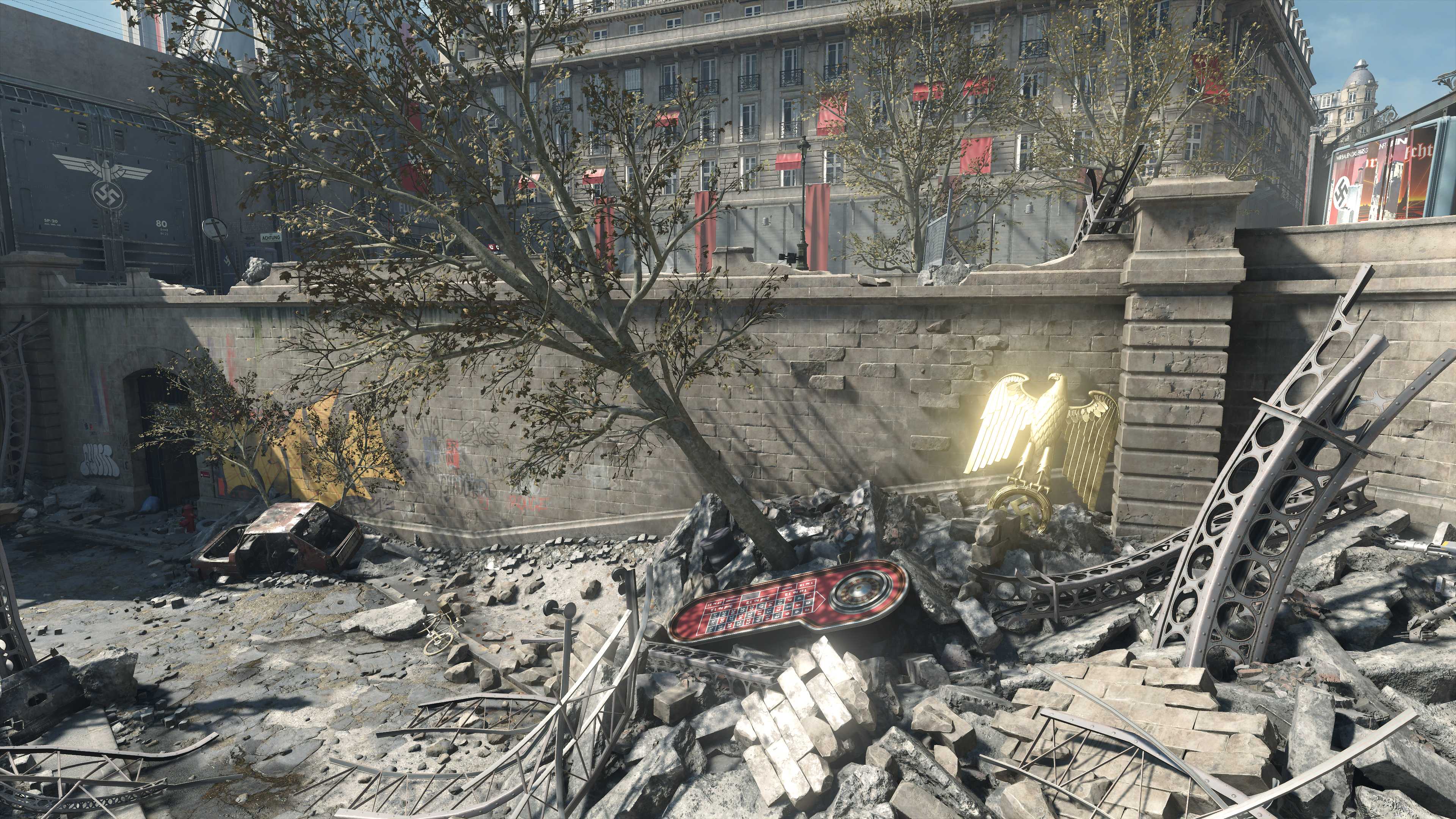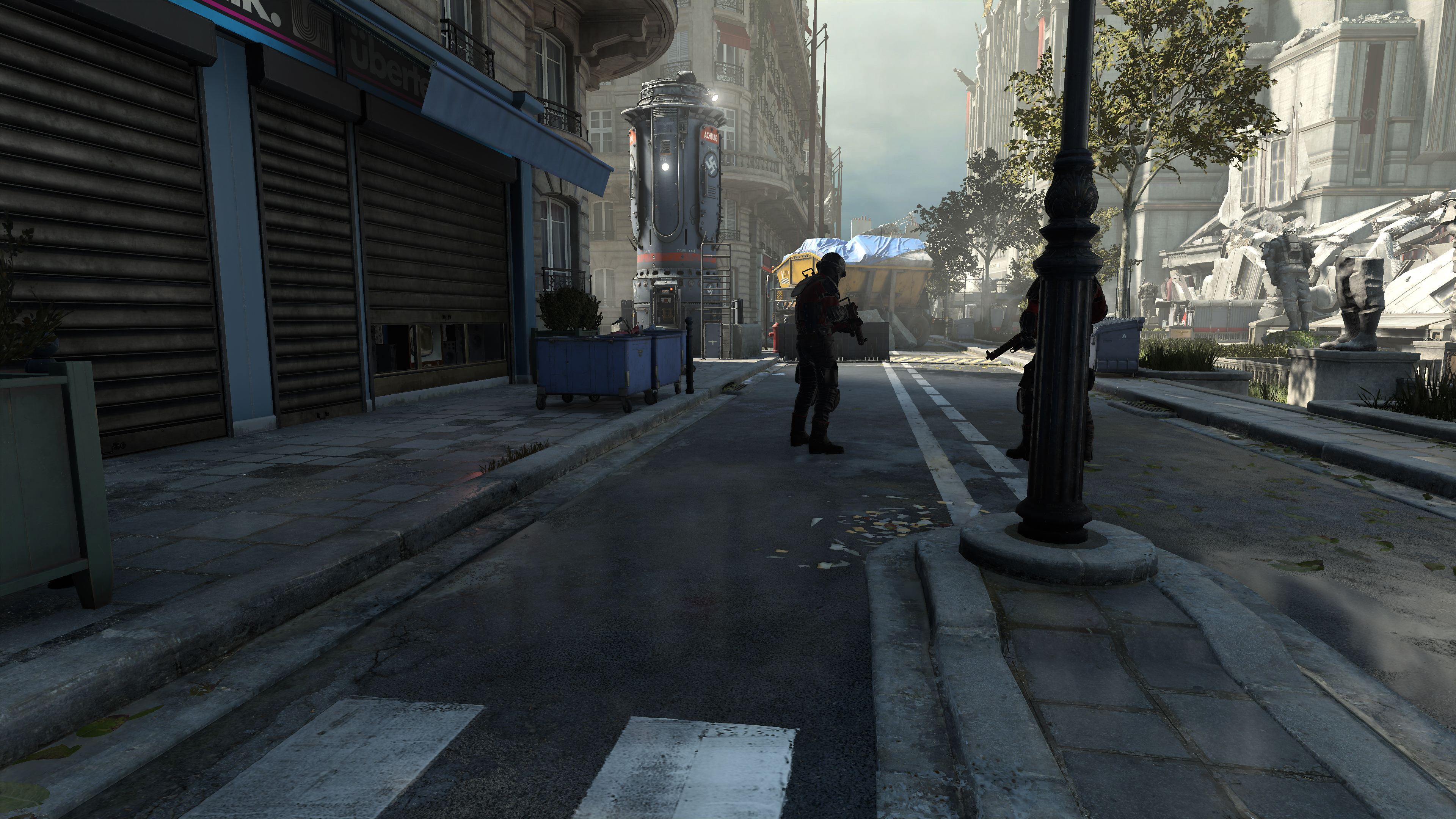 Wolfenstein: Youngblood's volumetric effects are generally found where bright light illuminates an area, exemplified in the three examples below. By raising their fidelity from Medium to High, they blend with the scenery more realistically, eliminating the shadowy blemishes a keen observer may notice (the artifacts around the "Halt" pillar in our first comparison, for example):