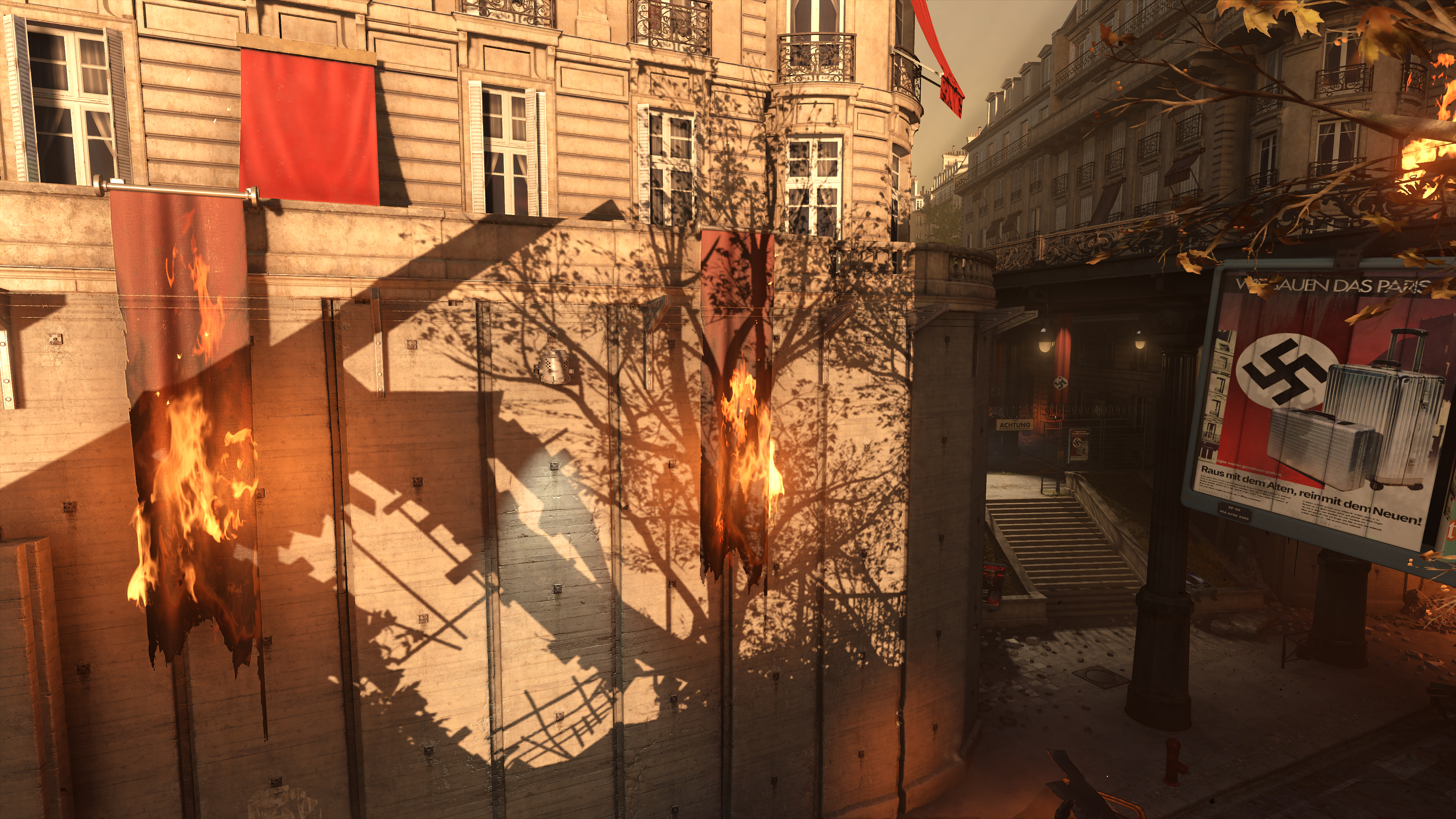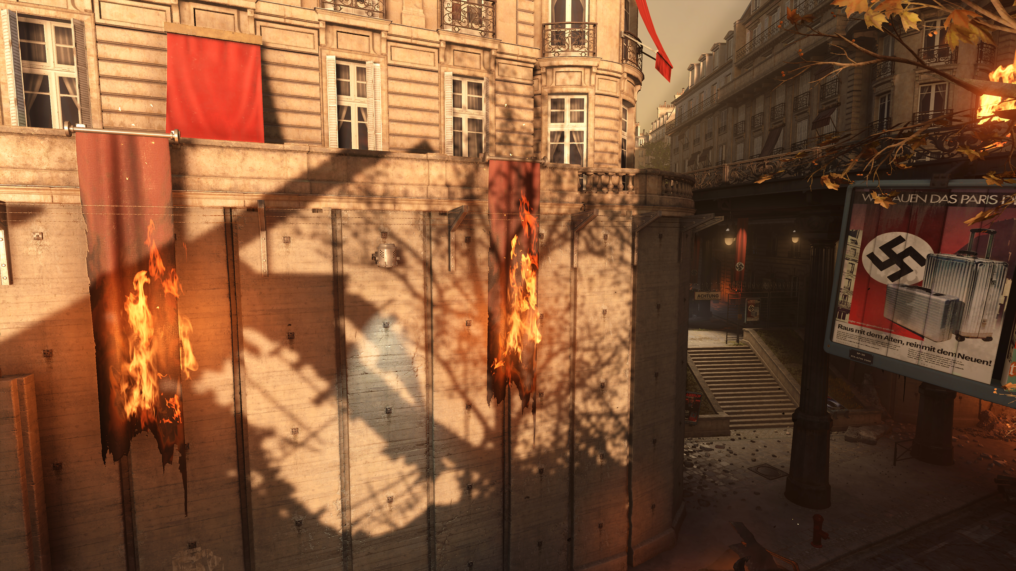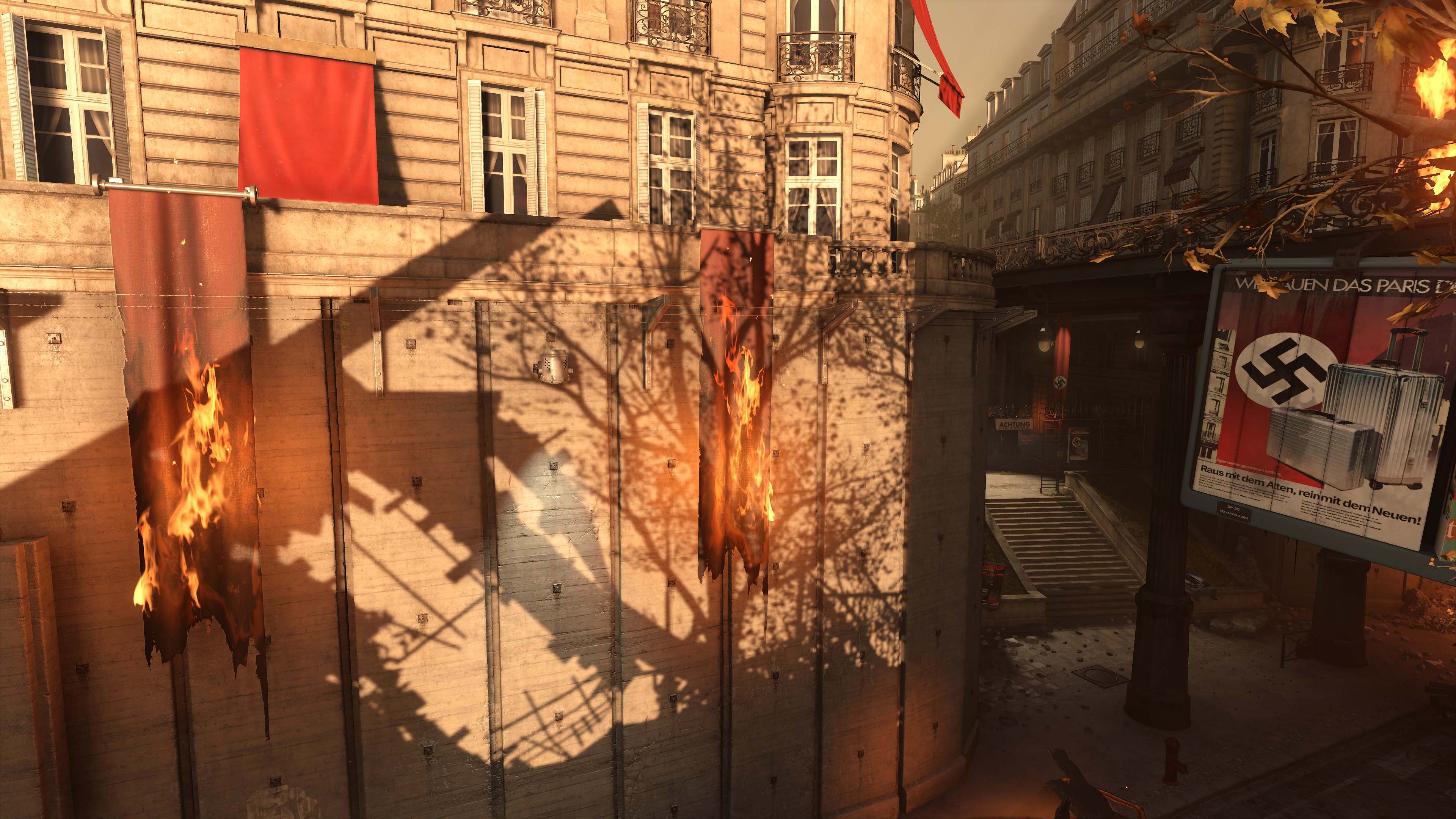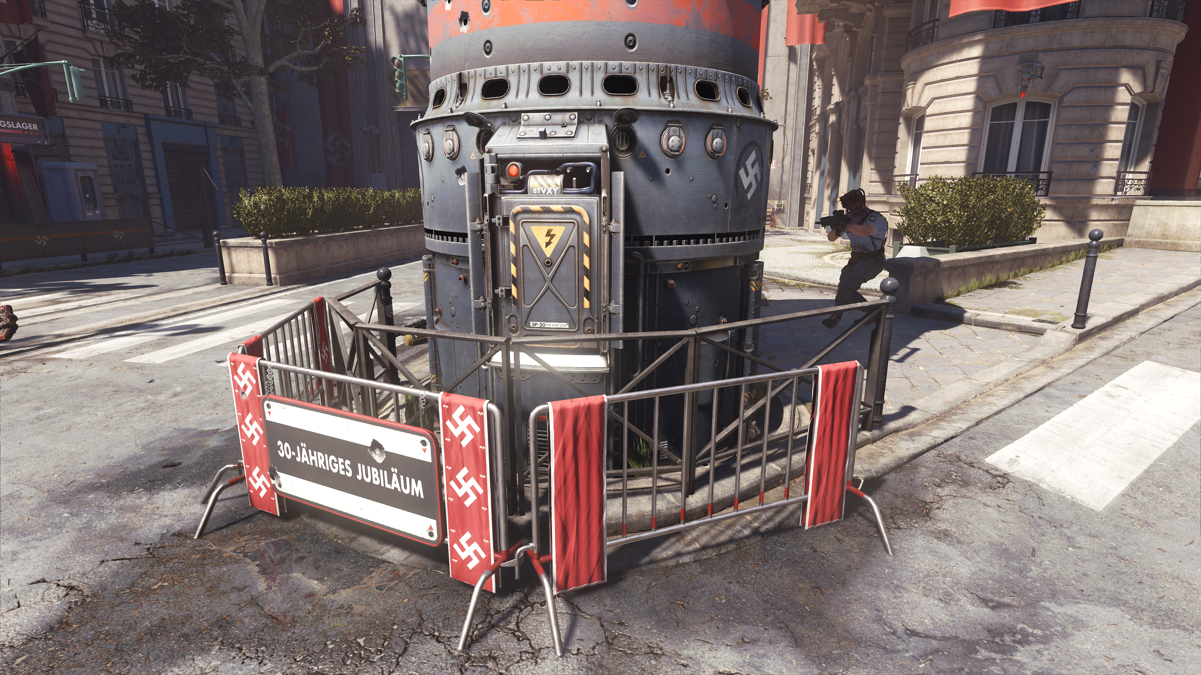 Wolfenstein: Youngblood's volumetric effects are generally found where bright light illuminates an area, exemplified in the three examples below. By raising their fidelity from Medium to High, they blend with the scenery more realistically, eliminating the shadowy blemishes a keen observer may notice (the artifacts around the "Halt" pillar in our first comparison, for example):