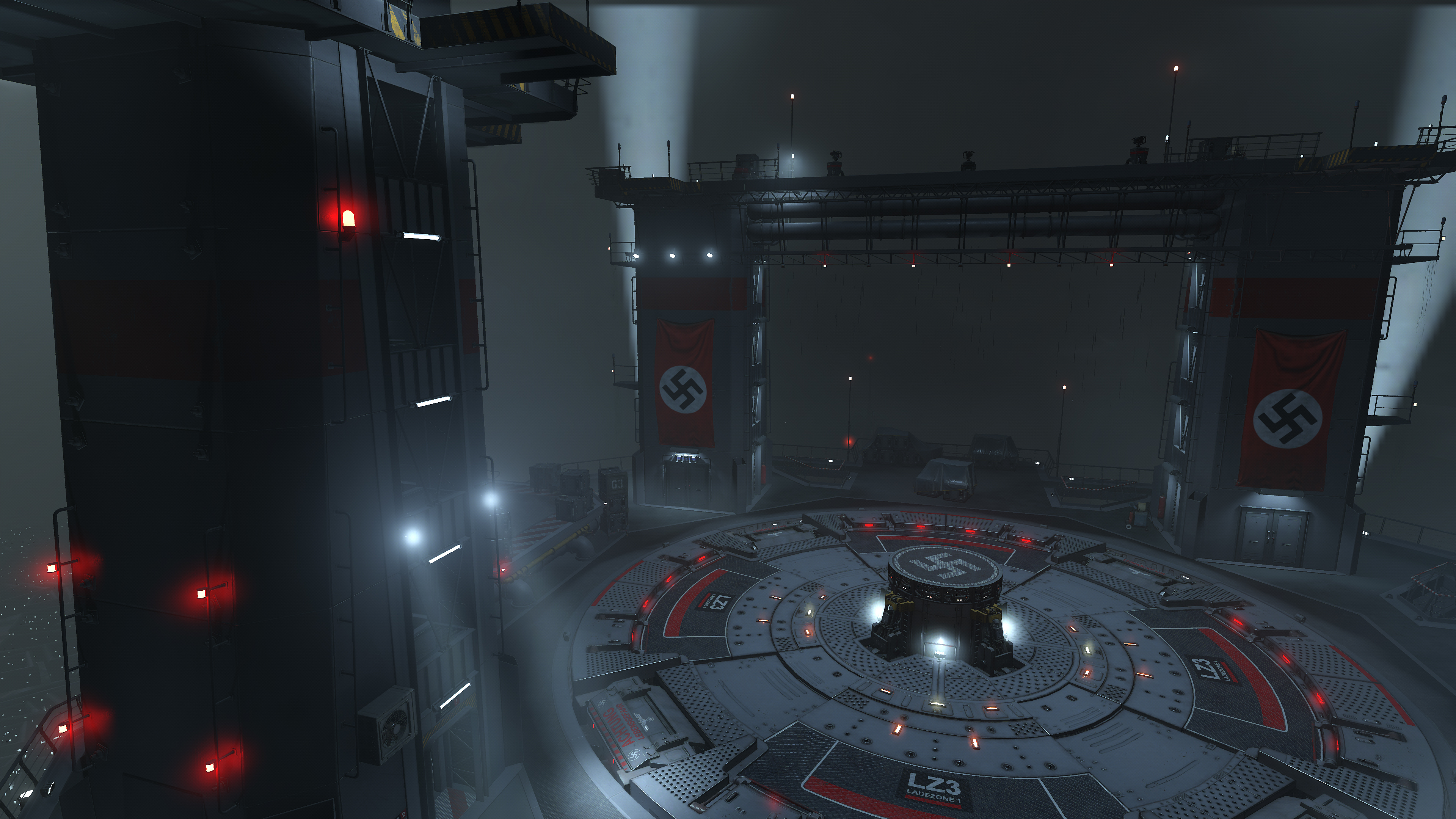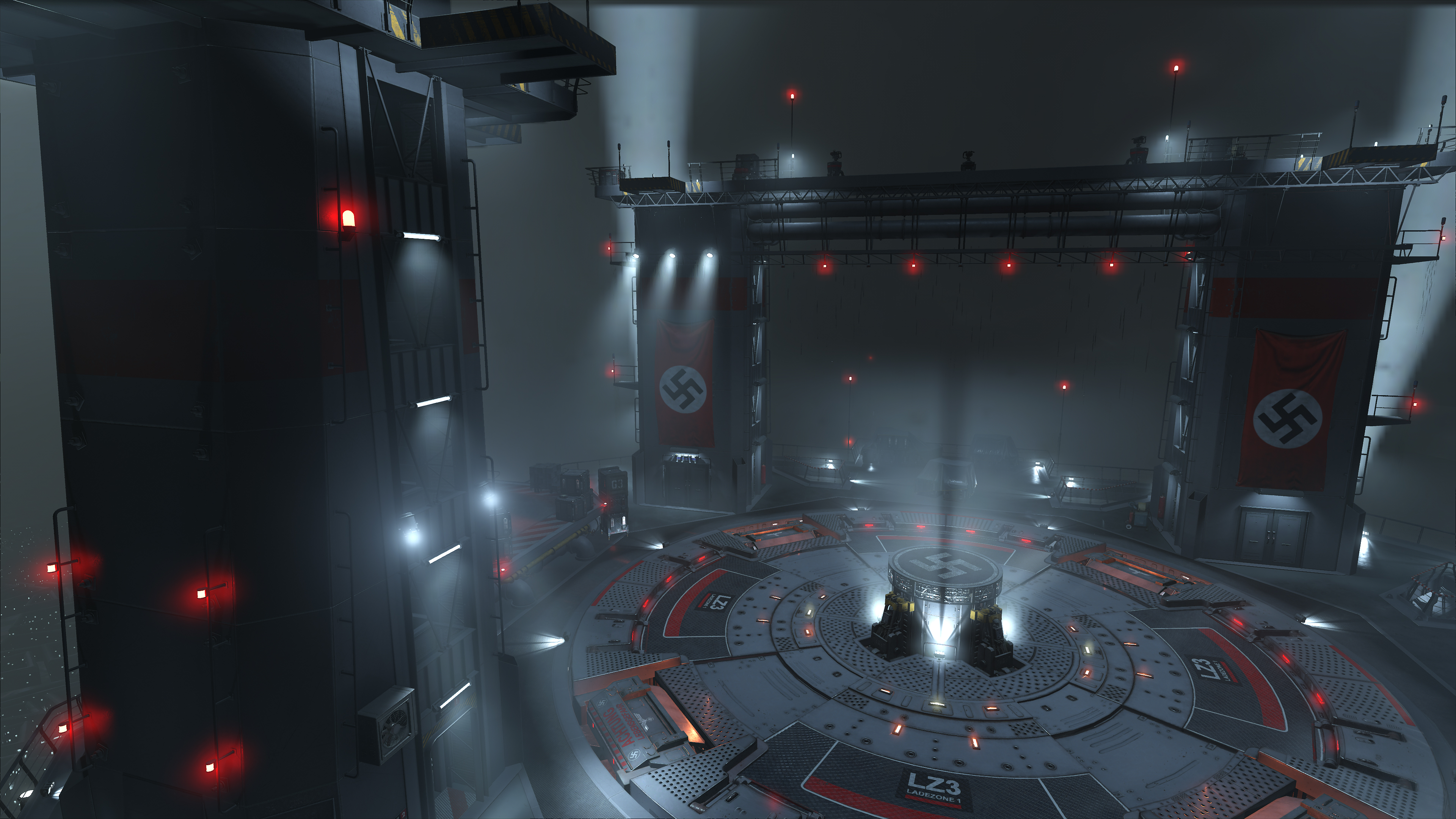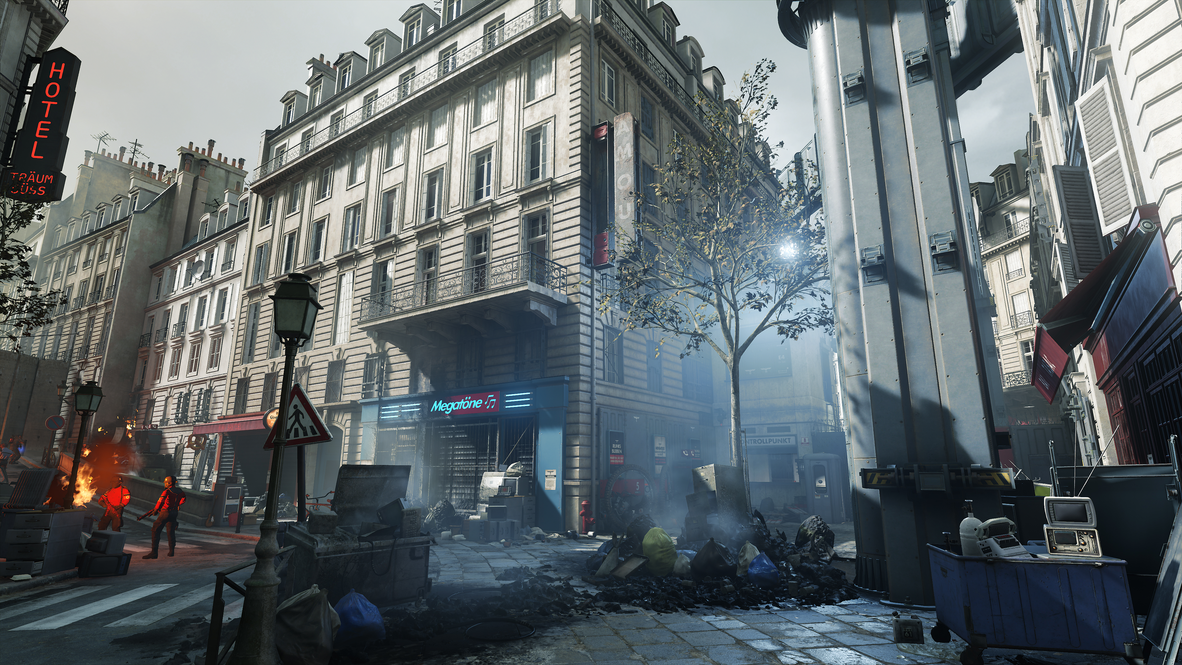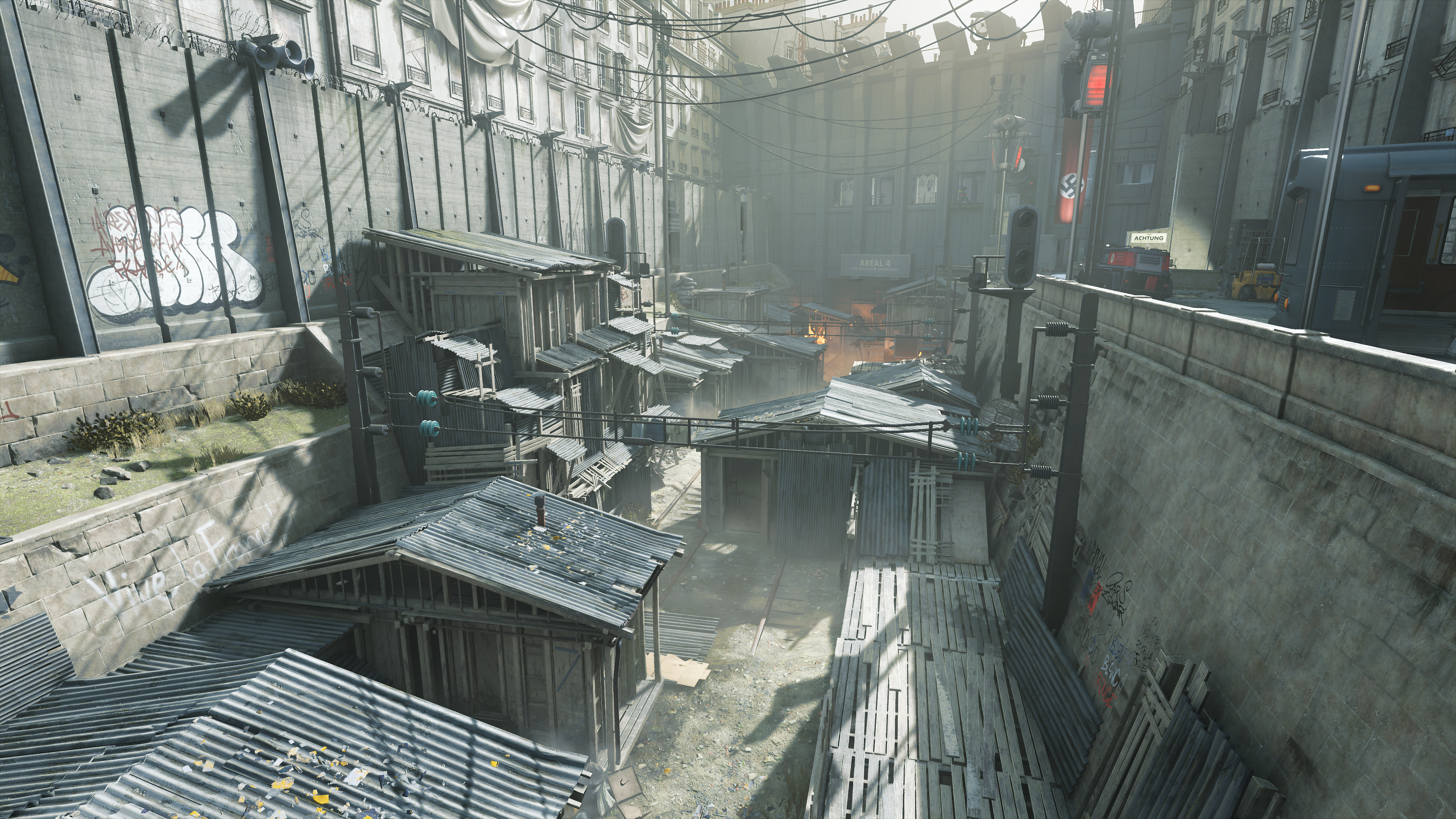 Wolfenstein: Youngblood's volumetric effects are generally found where bright light illuminates an area, exemplified in the three examples below. By raising their fidelity from Medium to High, they blend with the scenery more realistically, eliminating the shadowy blemishes a keen observer may notice (the artifacts around the "Halt" pillar in our first comparison, for example):