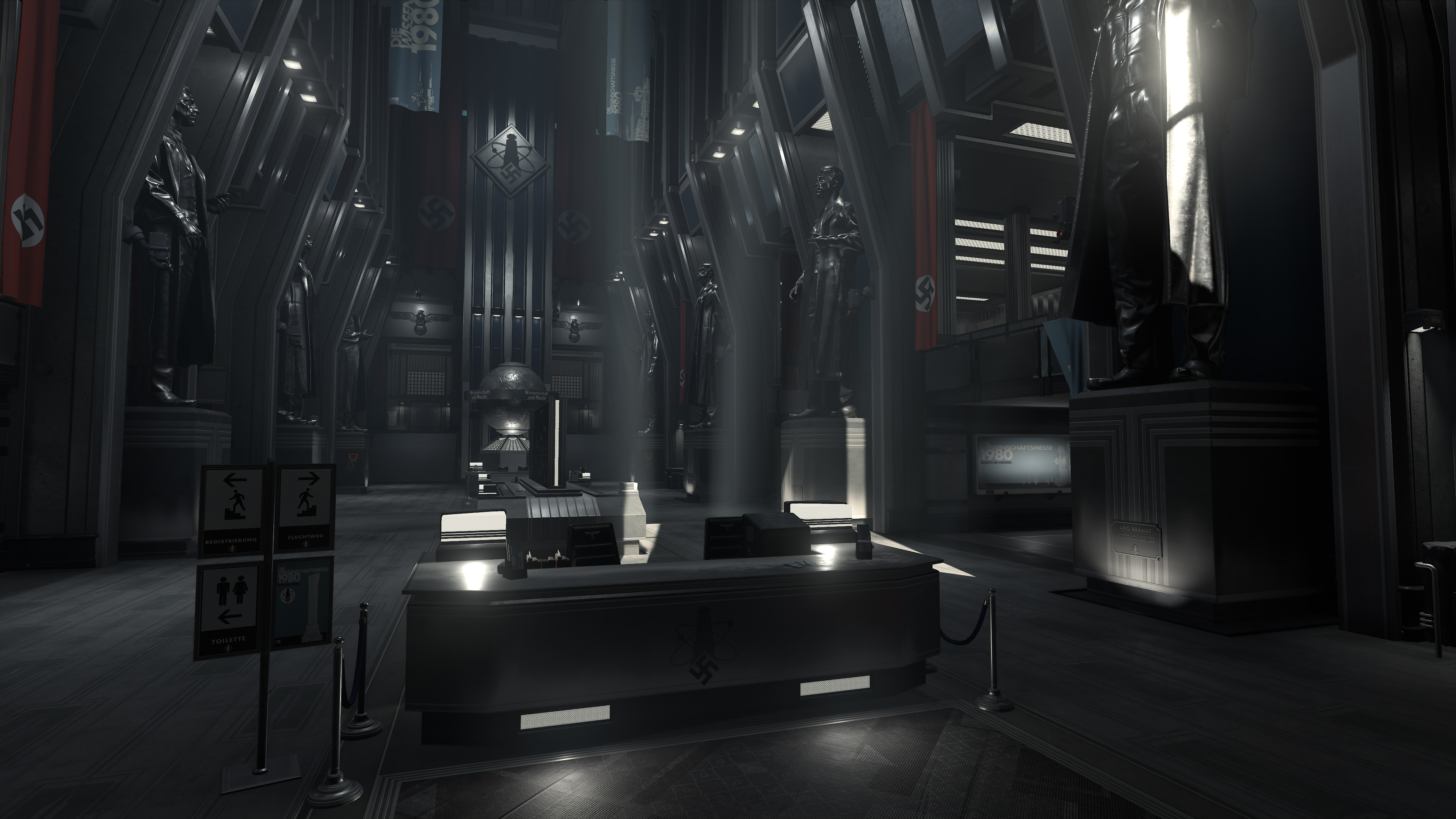 In Wolfenstein: Youngblood, Ray-Traced Reflections will accurately simulate the way light reflects on glossy and metal surfaces by tracing a single bounce of reflection rays across the scene. Materials affected include smooth, natural mirrors, like windows and water, but also rougher surfaces like brushed metal. Unlike screen space techniques, which can only reflect what’s on screen, ray-traced reflections incorporate the entire scene around the character, and can accurately represent objects outside the camera view, as well as those facing away from the camera. These reflections will enhance everything, from street scenes to secret labs, to casinos and control centers.