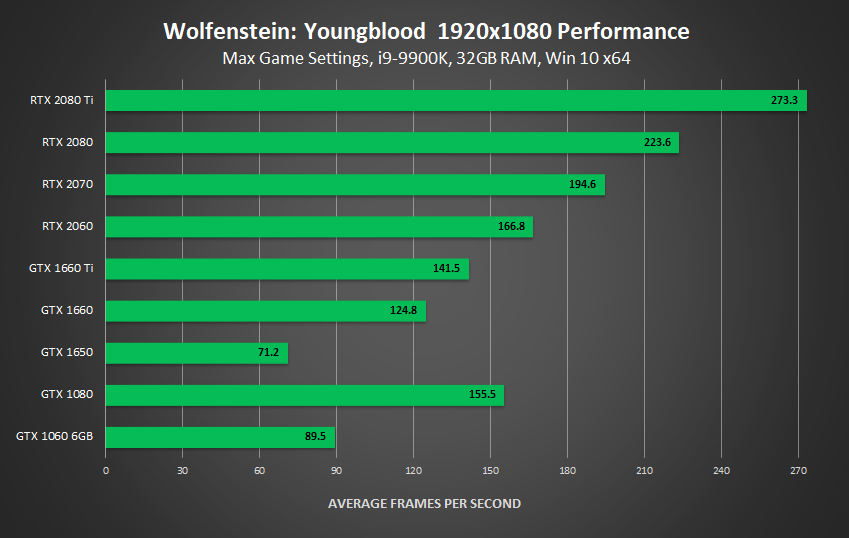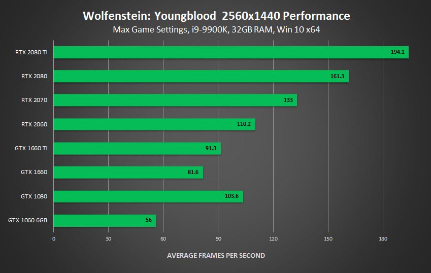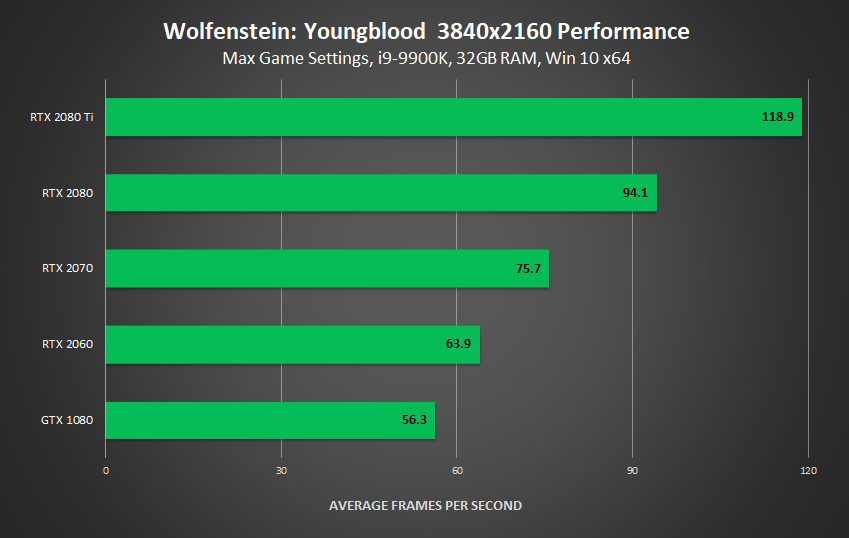 In conclusion, virtually any supported GPU can attain a playable Wolfenstein: Youngblood experience, and a vast number of modern GPUs will deliver excellent fidelity and framerates at 1920x1080 and 2560x1440. But if you want that ultimate 4K experience, with everything set to 11, running at 60 FPS, you'll need, at minimum, an overclocked GeForce GTX 1080, a GeForce GTX 1080 Ti, or a GeForce RTX 2060.
