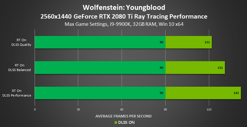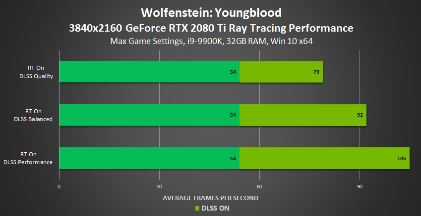 With Wolfenstein: Youngblood running at high framerates on all GeForce RTX graphics cards, ray tracing is possible at all resolutions, even 4K. And with DLSS enabled, performance is accelerated by a significant degree, enabling you to enjoy massively improved ray-traced graphics at over 100 FPS at 4K, and at over 150 FPS at lower resolutions:
