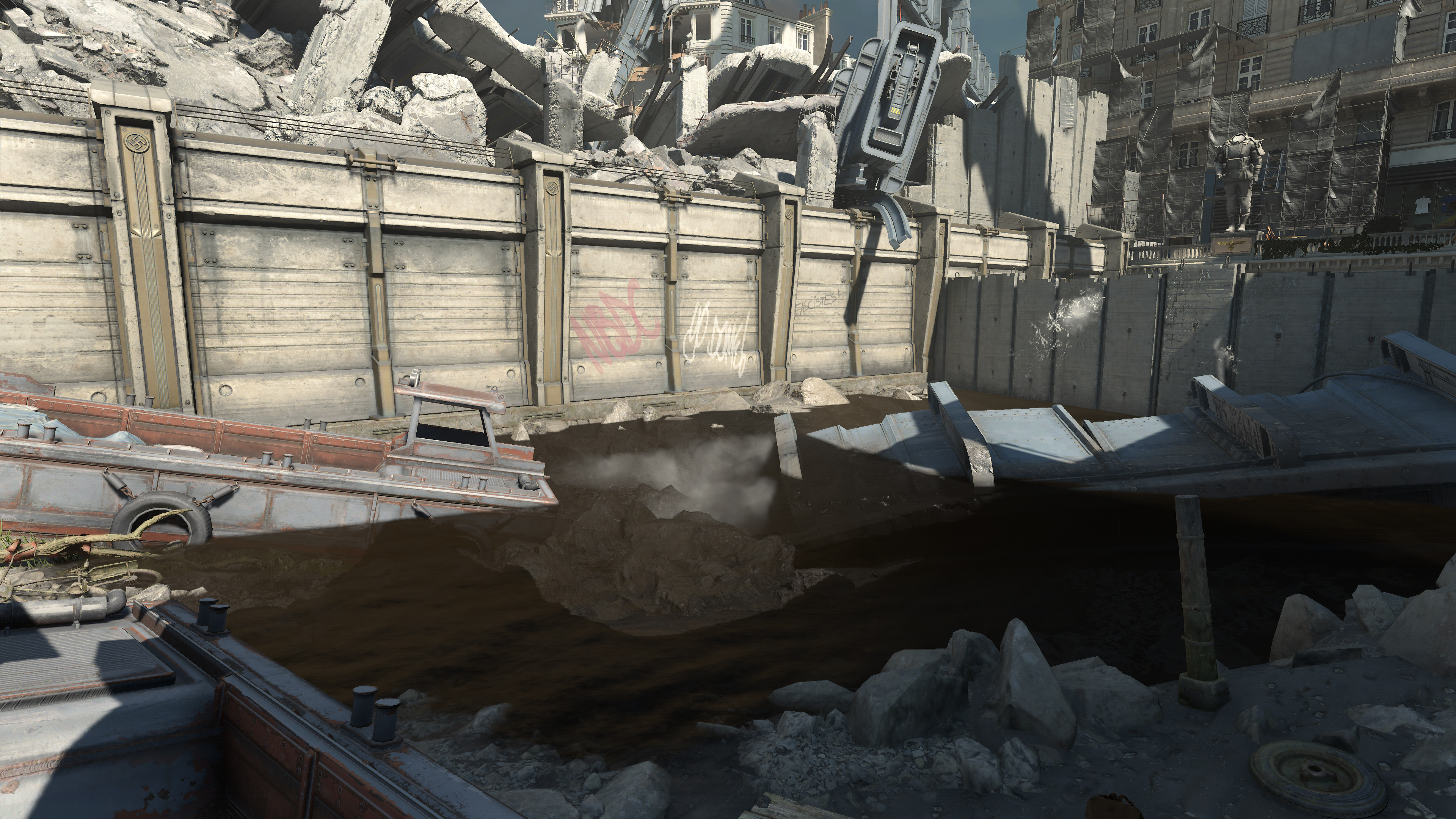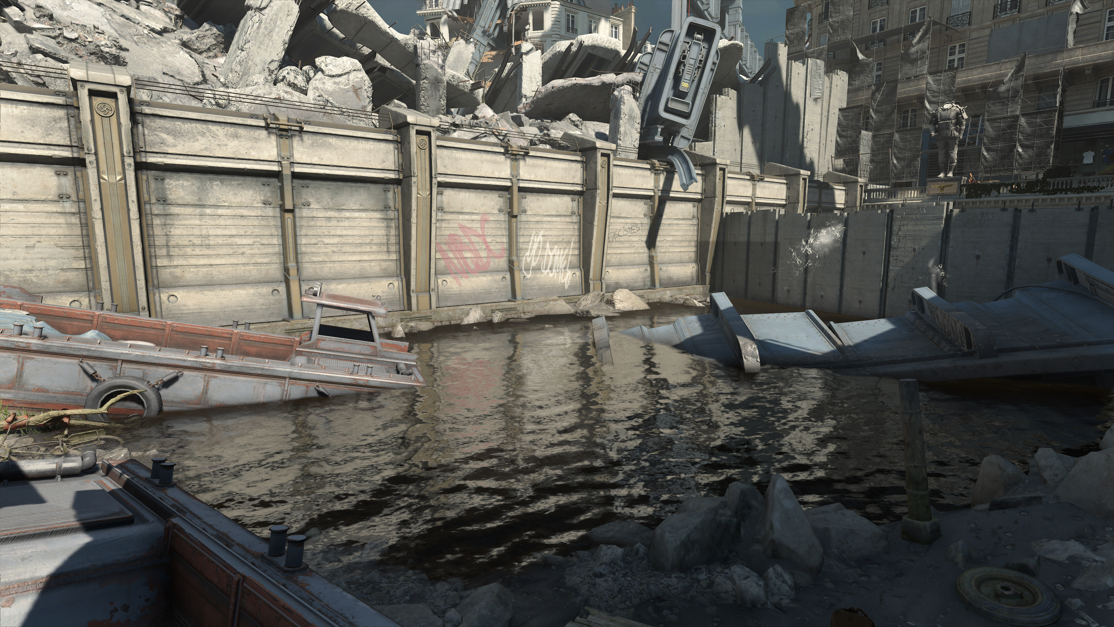Set in and around Paris, there's a fair bit of water to be found in Wolfenstein: Youngblood, and using the Water Quality setting its fidelity can be adjusted. Specifically, items affected include, the quality of the water simulation, the quality of the reflections seen on the water's surface, the ability for water to affect the appearance of surrounding game elements, and whether the water's surface correctly blocks the display of underwater detail.