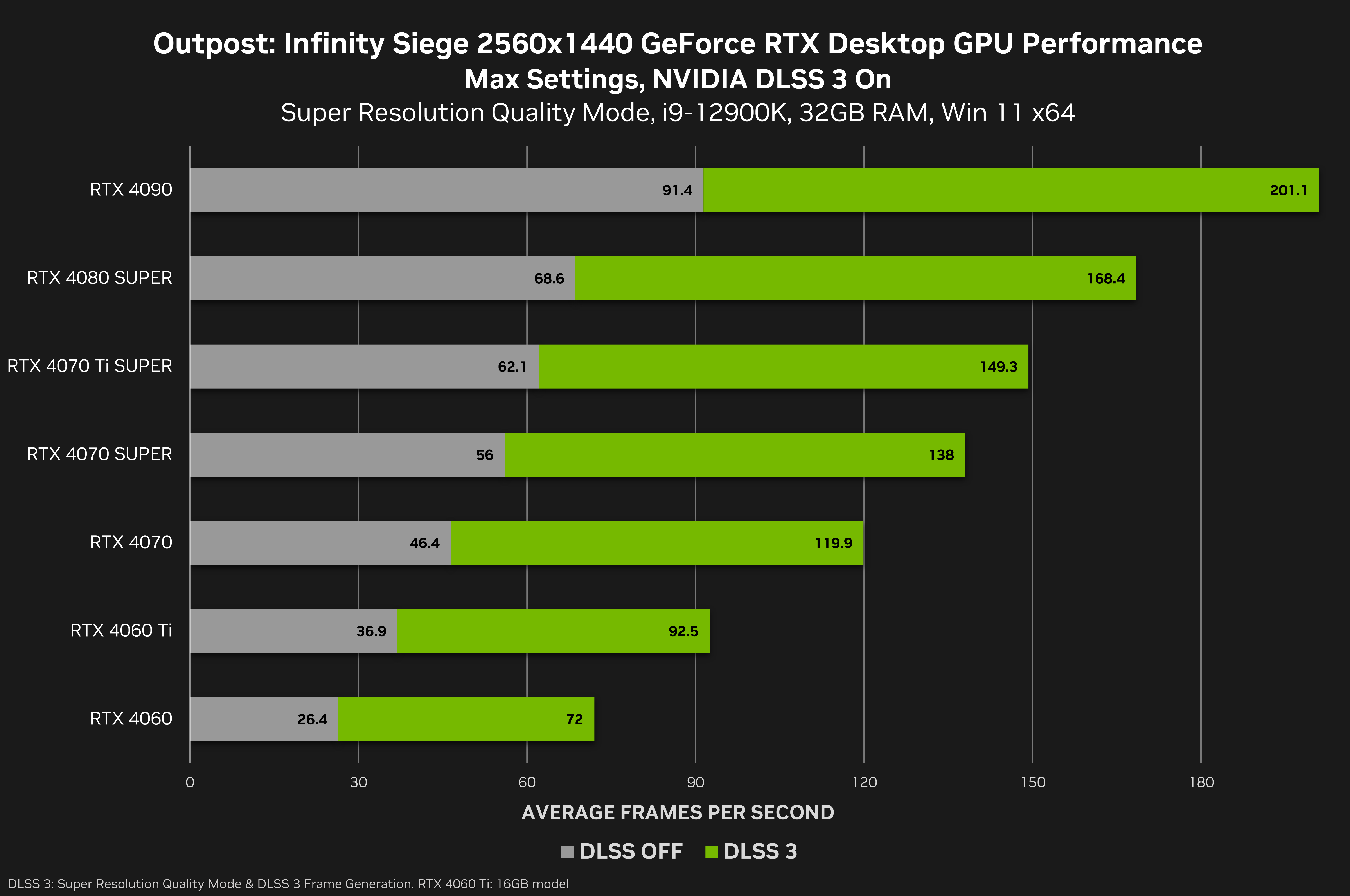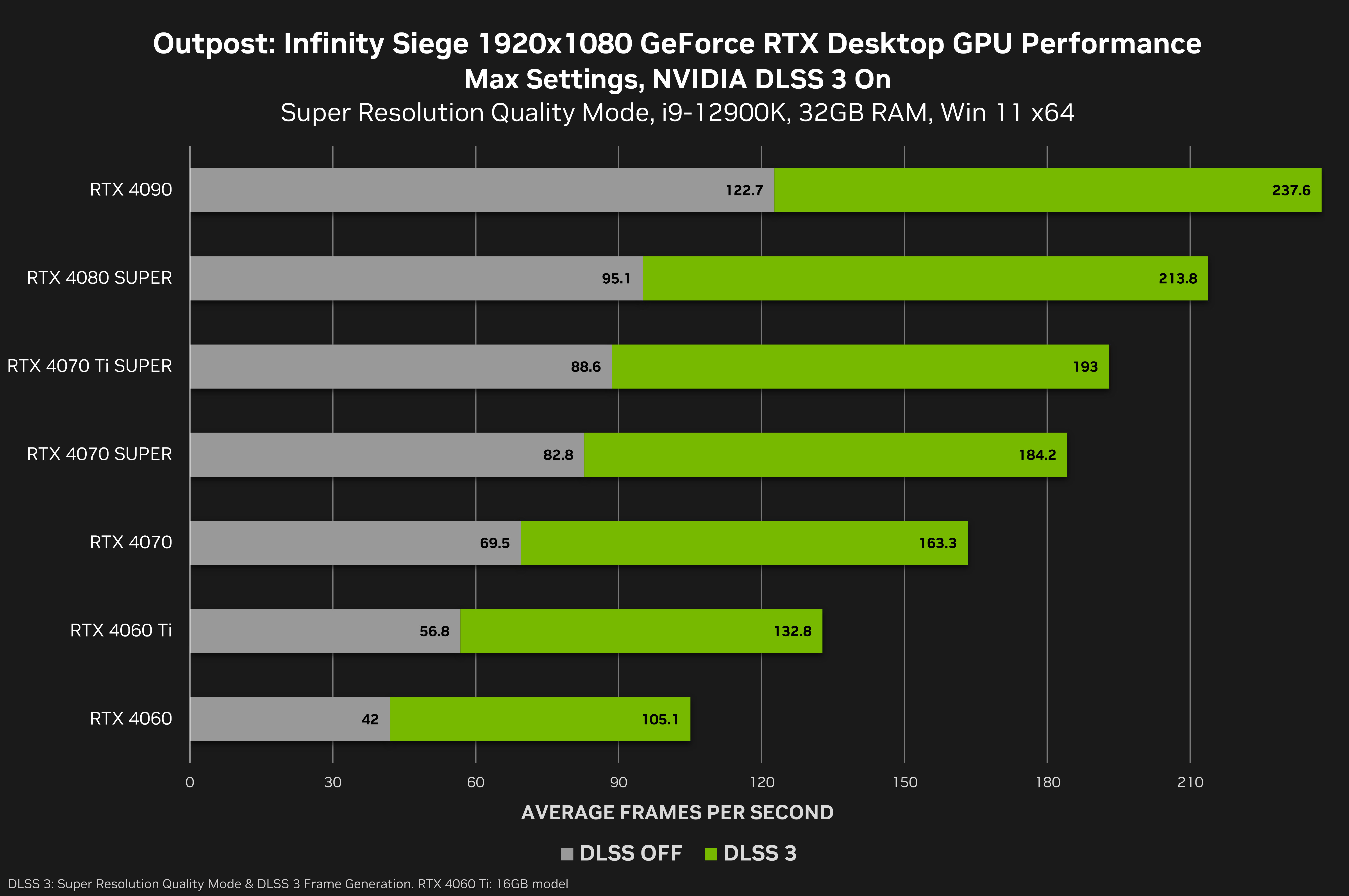 At 4K, with every setting maxed out, DLSS 3 will multiply performance by an average of 3.3X in Outpost: Infinity Siege. With this massive frame rate boost, GeForce RTX 4090 users can hit 160 FPS, the GeForce RTX 4080 SUPER exceeds 120 FPS, the GeForce RTX 4070 Ti SUPER tops 110 FPS, and the GeForce RTX 4070 SUPER surpasses 100 FPS, giving GeForce RTX 40 Series gamers the definitive experience at the highest resolution, with everything cranked.