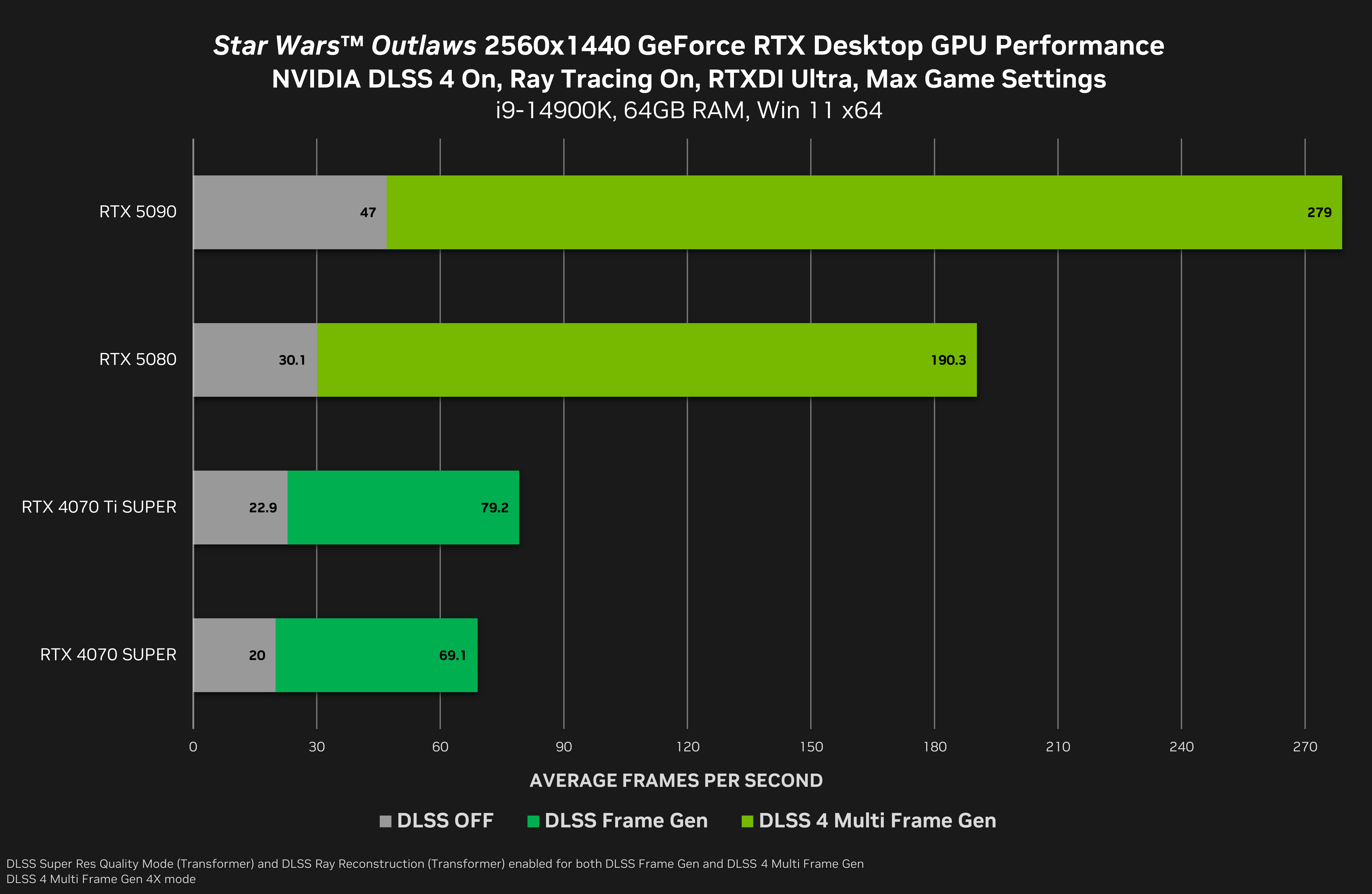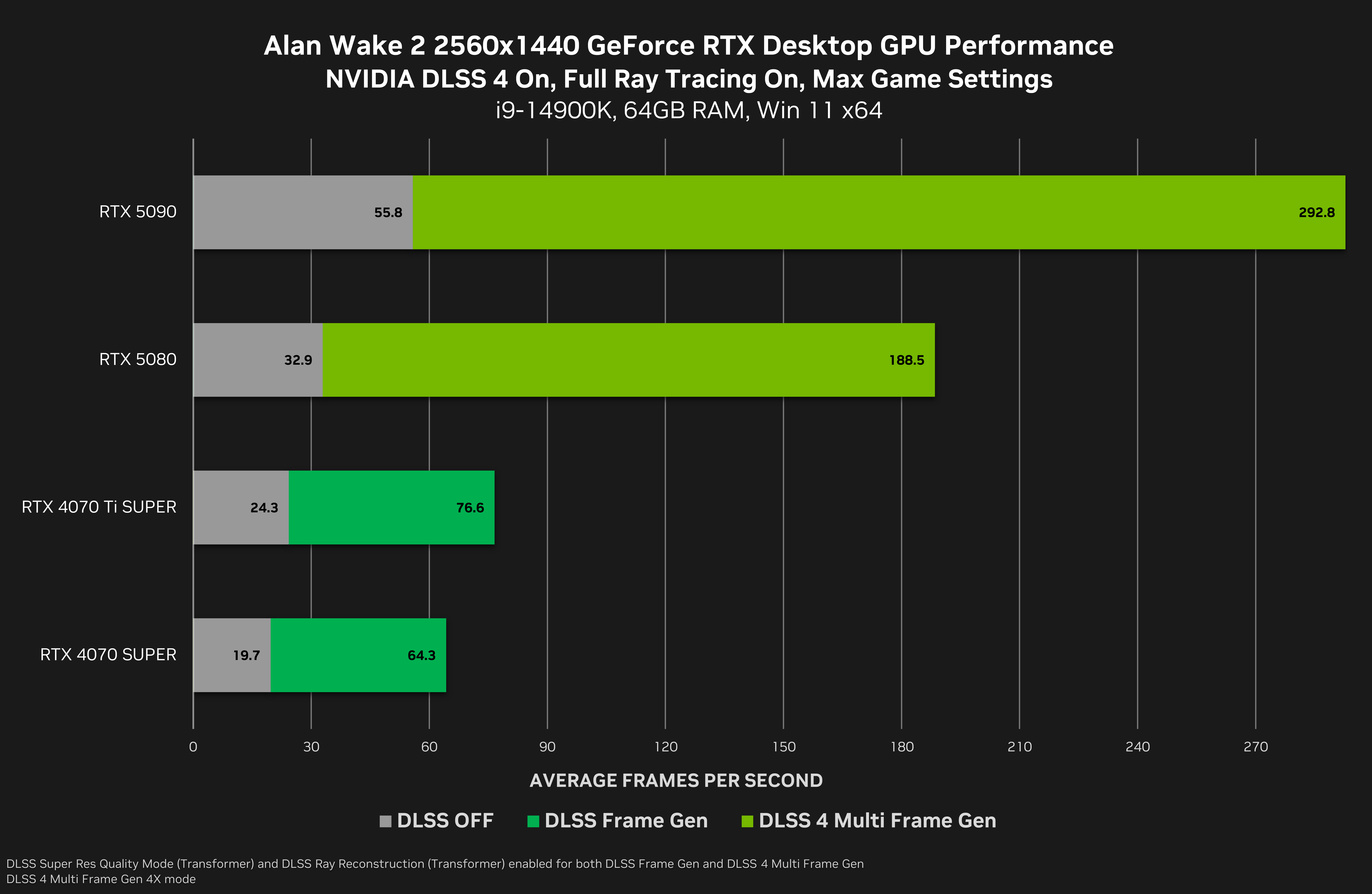 At 2560x1440, GeForce RTX 50 Series GPUs are 4X faster on average than traditional brute-force rendering, when leveraging DLSS Multi Frame Generation and the complete suite of DLSS 4 technologies.