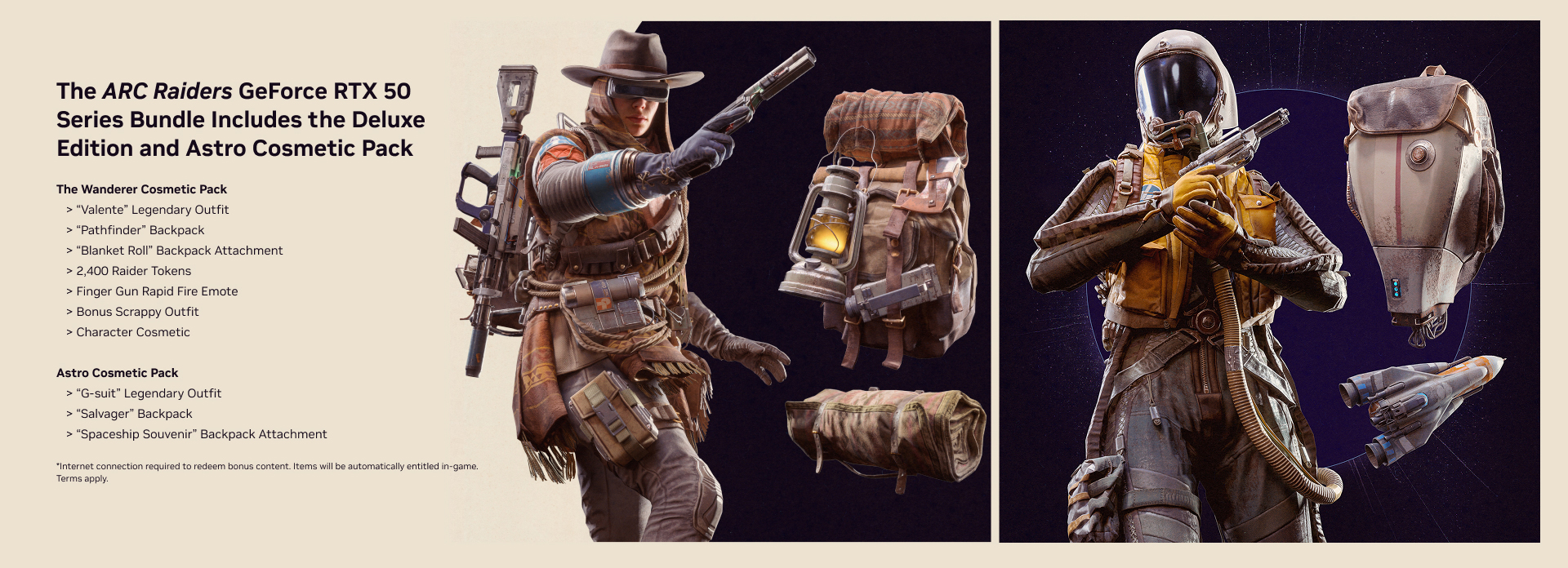 Starting today, as part of our ARC Raiders GeForce RTX 50 Series Bundle, you’ll receive a Deluxe Edition copy of the game, plus pre-order bonus cosmetics, with the purchase of qualifying GeForce RTX 5090, 5080, 5070 Ti, or 5070 desktops or graphics card, or laptops with a GeForce RTX 5090, 5080, 5070 Ti, or 5070 Laptop GPUs at participating retailers and etailers.