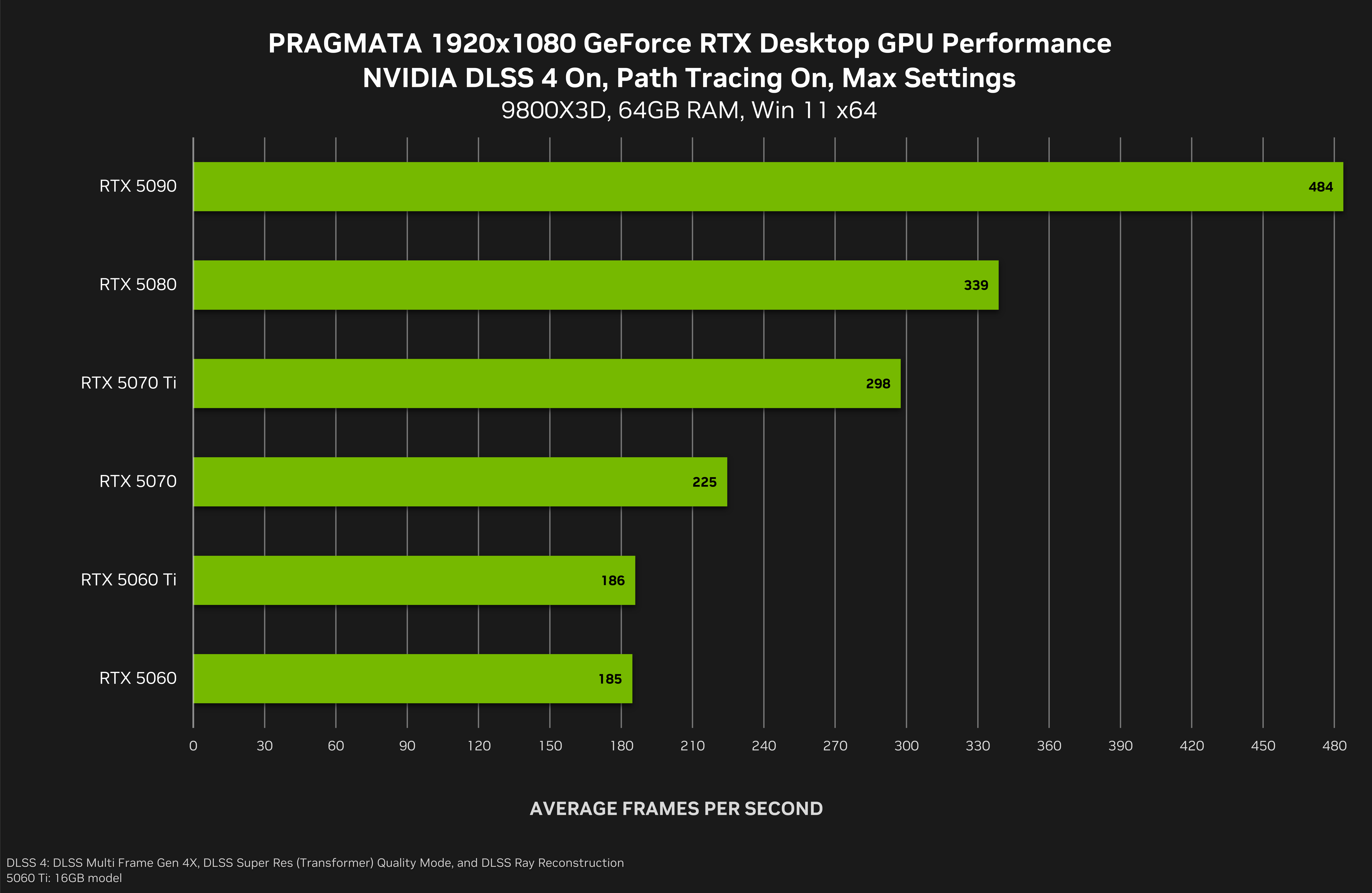 At 1920x1080, the majority of GeForce RTX 50 Series gamers can play PRAGMATA at super smooth, super fast frame rates, with path tracing and maxed out settings, thanks to DLSS Ray Reconstruction and DLSS Multi Frame Generation 4X Mode. The GeForce RTX 5090 hits an astonishing 480 frames per second, the GeForce RTX 5080 surpasses 330 frames per second, the GeForce RTX 5070 Ti exceeds 290 frames per second, the GeForce RTX 5070 runs at over 220 frames per second, and the GeForce RTX 5060 Ti and GeForce RTX 5060 each eclipse 180 frames per second.