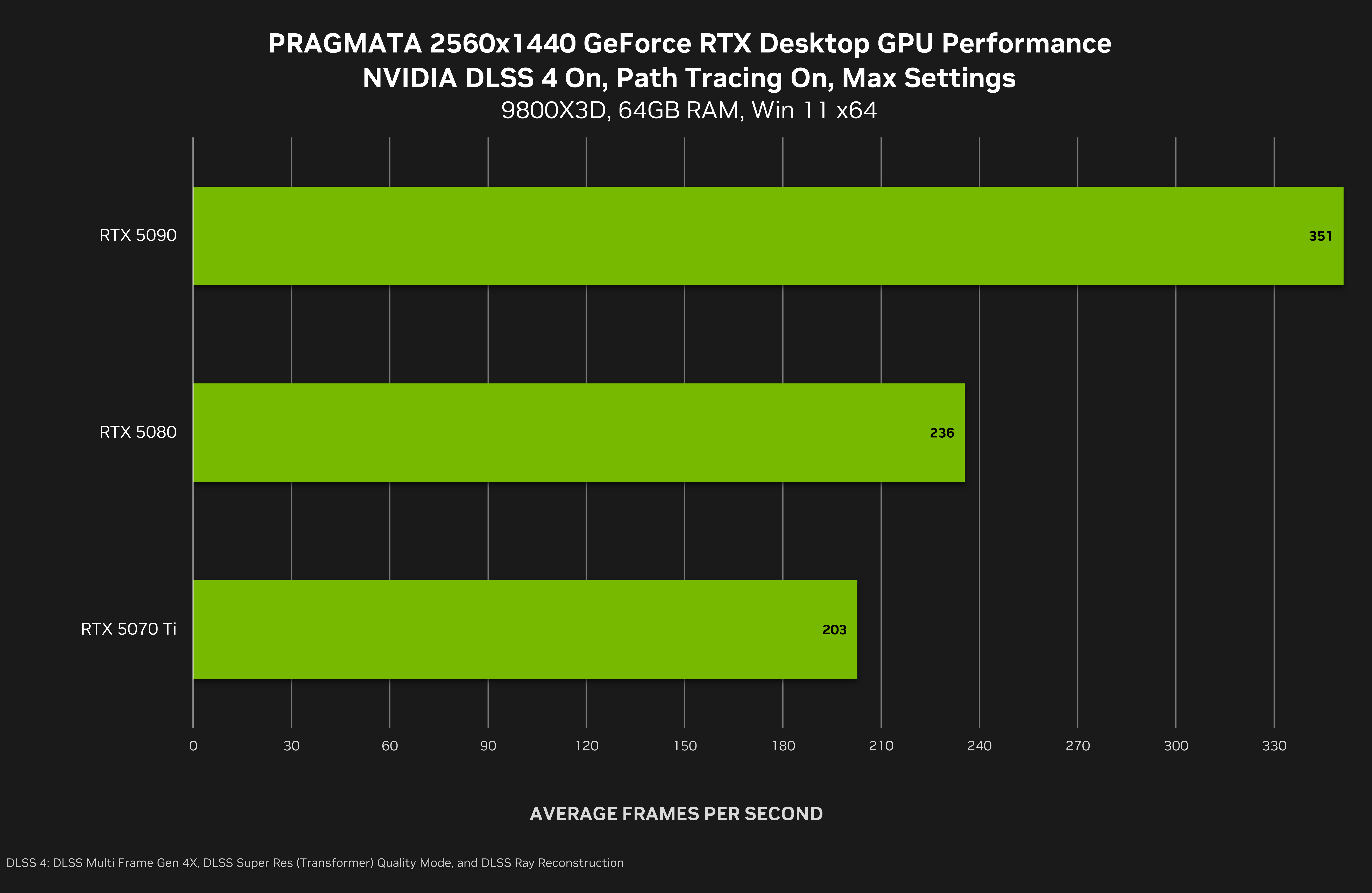 At 2560x1440, GeForce RTX 5090 owners can experience path-traced PRAGMATA at a blistering 350 frames per second thanks to DLSS Ray Reconstruction and DLSS Multi Frame Generation 4X Mode. And GeForce RTX 5080 and GeForce RTX 5070 Ti owners can play at over 200 frames per second, with every setting maxed out.