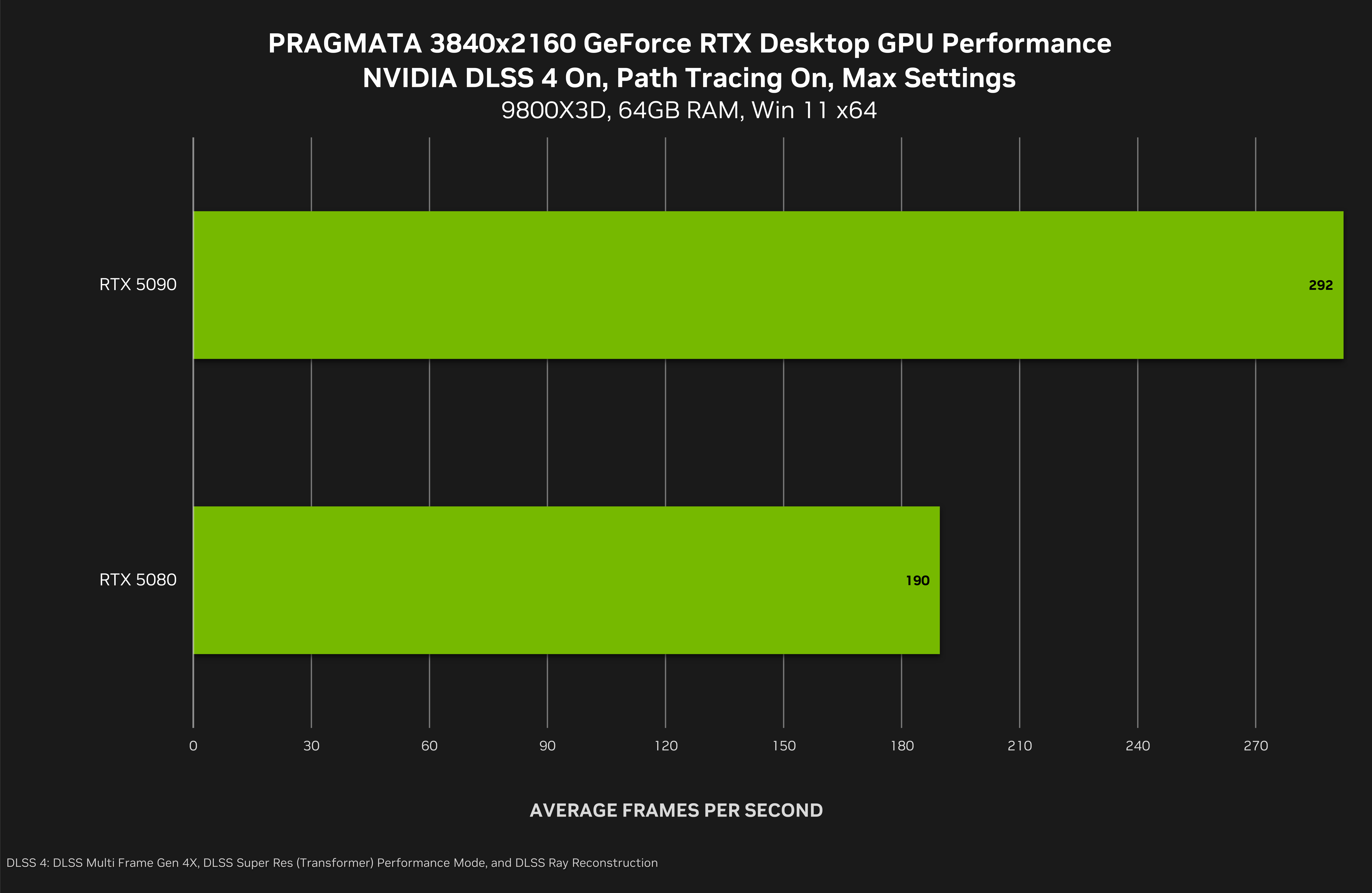 At 4K, GeForce RTX 5090 owners can experience PRAGMATA at its very best at over 290 frames per second, at max settings, with path tracing, DLSS Ray Reconstruction, and DLSS Multi Frame Generation 4X Mode. And GeForce RTX 5080 owners can play at 190 frames per second.