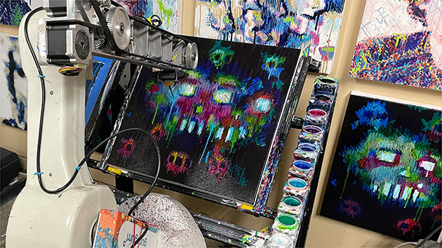 Pindar Van Arman has spent the last fifteen years deconstructing his creative process by teaching it to painting robots. His machines make marks, use AI to analyze the marks, then make more marks based on the analysis, repeating this cycle over and over again in a creative feedback loop. Their collaborative paintings take days to complete, revealing the parts of his creativity that are simply an algorithm, and the parts that make it human.