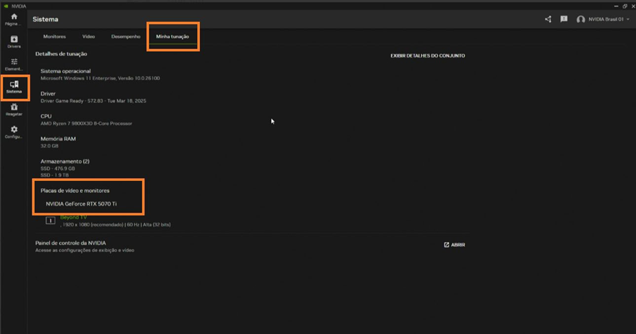 c. Screenshot da sua conta no NVIDIA App mostrando a placa de vídeo instalada: Abra o NVIDIA App > sistema > minha tunação (exemplo abaixo)