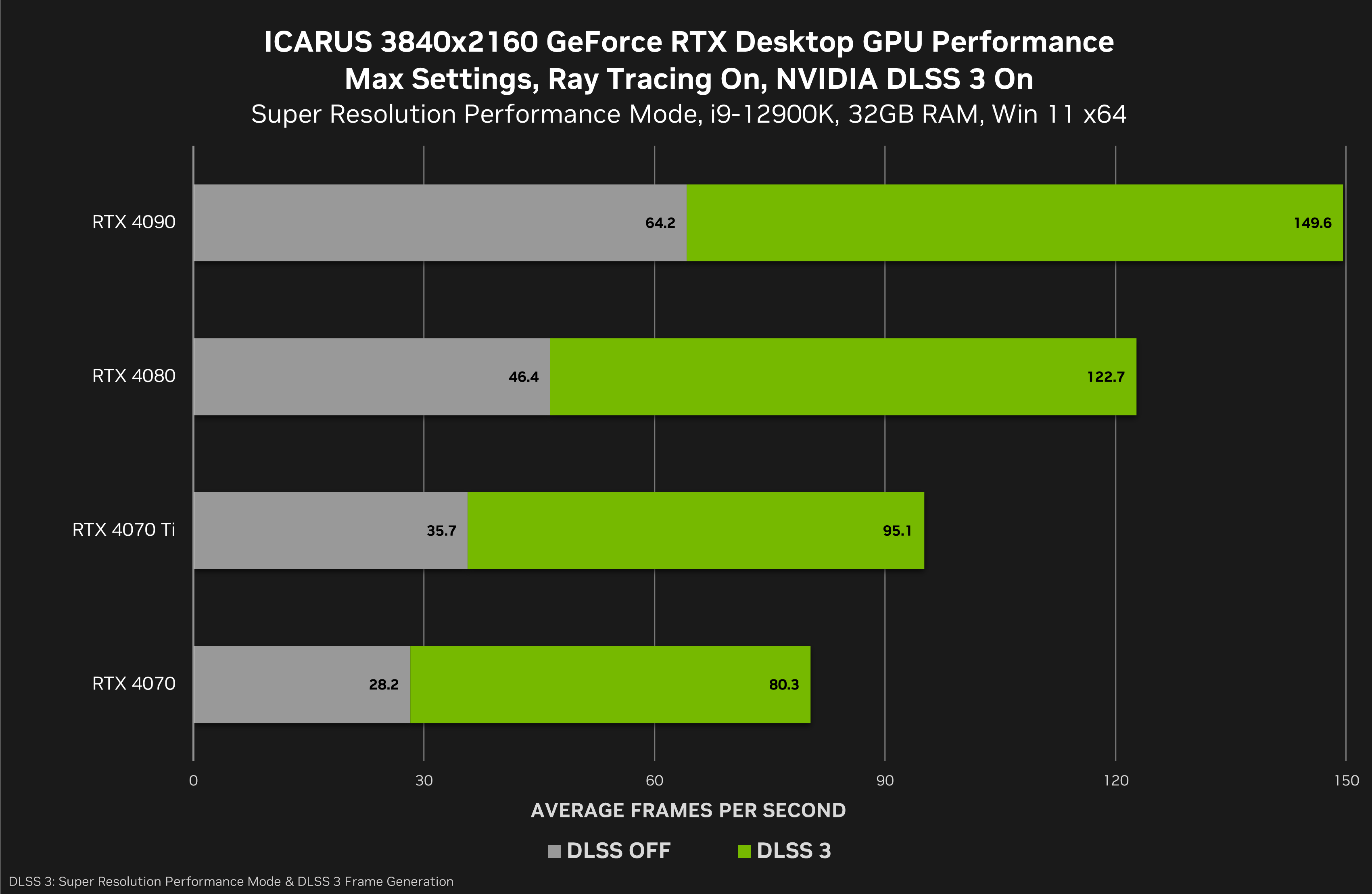 Poucos dias atrás, uma nova atualização levou ao ICARUS o DLSS 3, aumentando o desempenho em uma média de 2,6X, permitindo configuração máxima e gameplay com ray tracing em muitos setups com GeForce RTX Série 40.