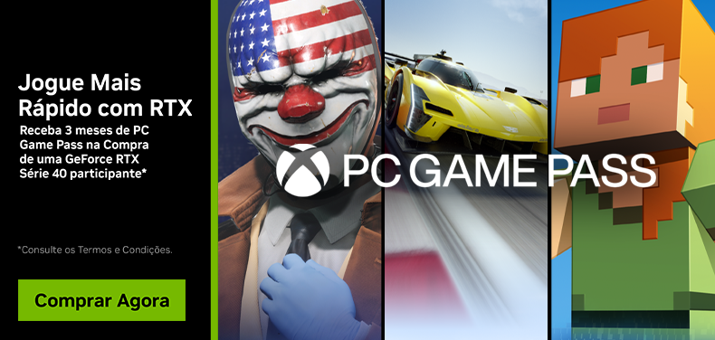 A promoção Jogue Mais Rápido com as GeForce RTX Série 40 já está disponível! De 28 de novembro a 8 de janeiro de 2024, compre uma placa de vídeo GeForce RTX 4090, 4080, 4070 Ti, 4070, 4060 Ti ou 4060 participante* e receba três meses de acesso gratuito ao PC Game Pass.