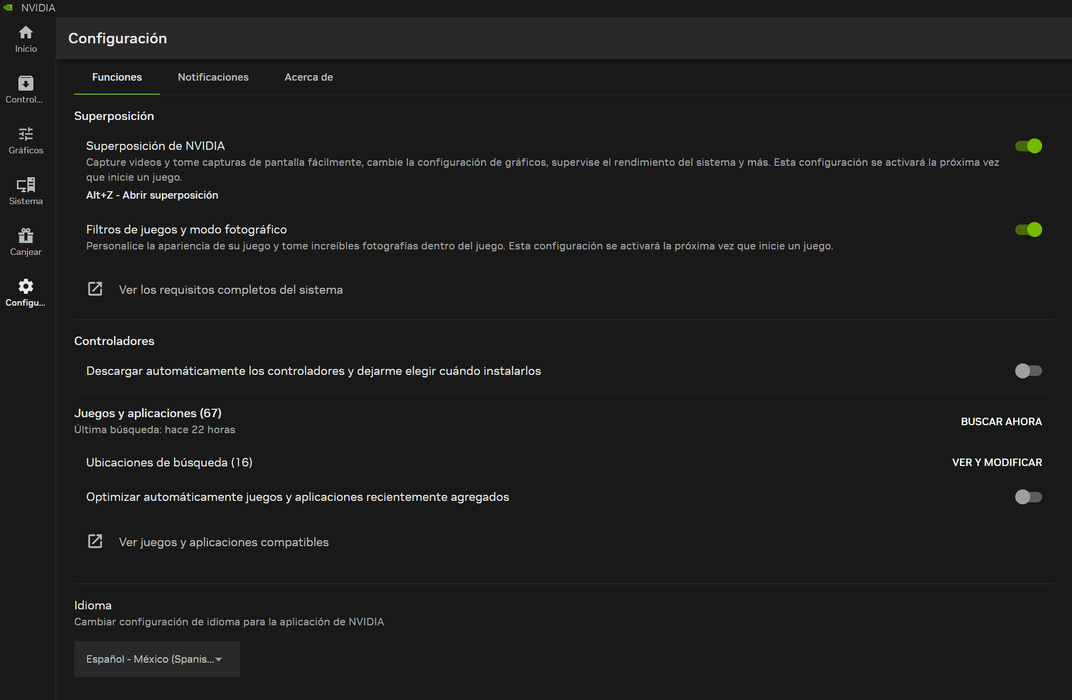 O beta do NVIDIA App agora oferece suporte a vários idiomas, conforme demonstrado no exemplo em espanhol acima
