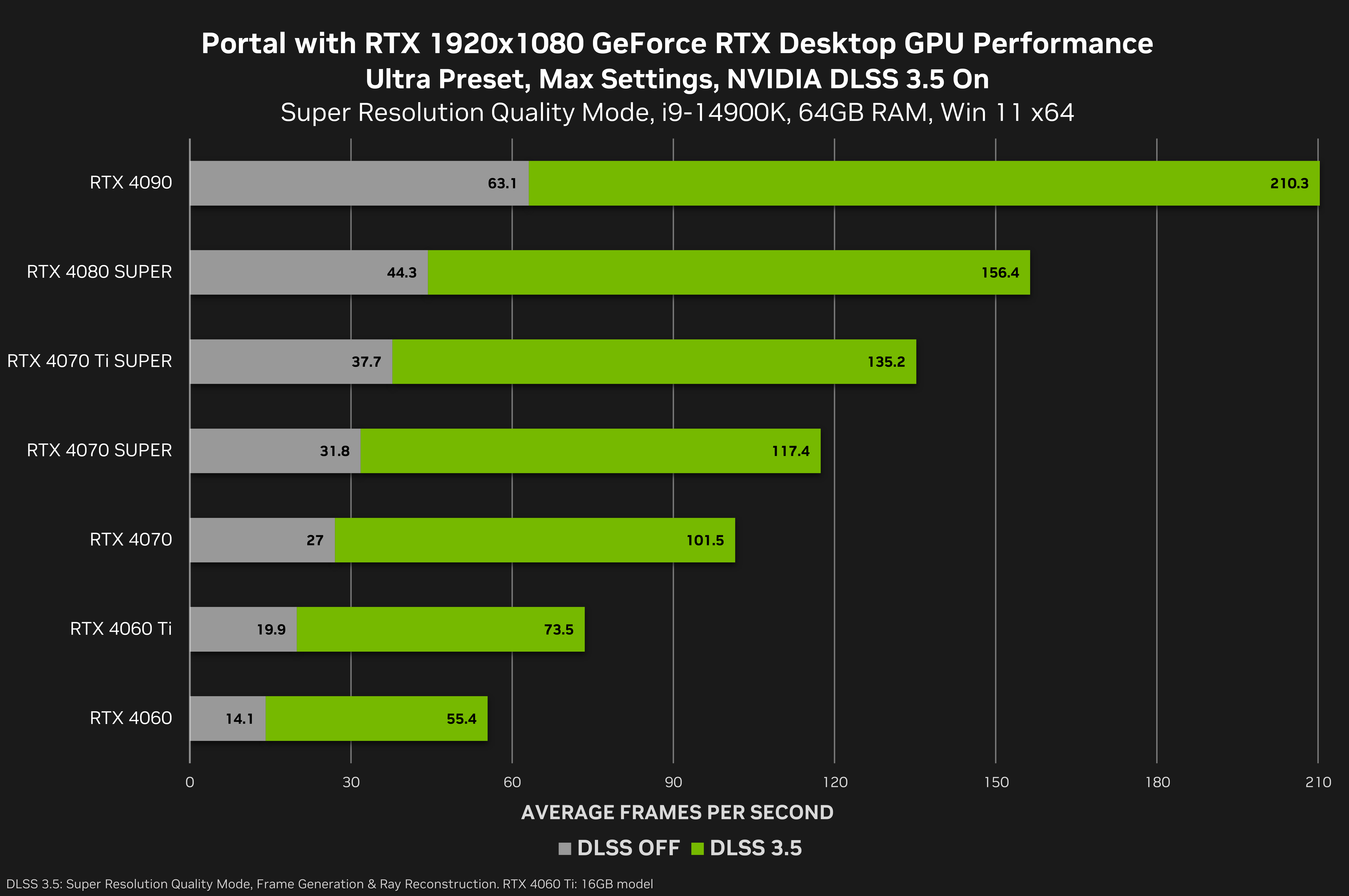 Habilitar o DLSS 3.5 Ray Reconstruction multiplicará as taxas de quadros na GeForce RTX 4090 em 6,2X, permitindo configuração máxima e jogabilidade 4K com ray tracing completo a mais de 100 FPS; na GeForce RTX 4080 SUPER, o desempenho é multiplicado por 6,7X para oferecer uma experiência de mais de 70 FPS.