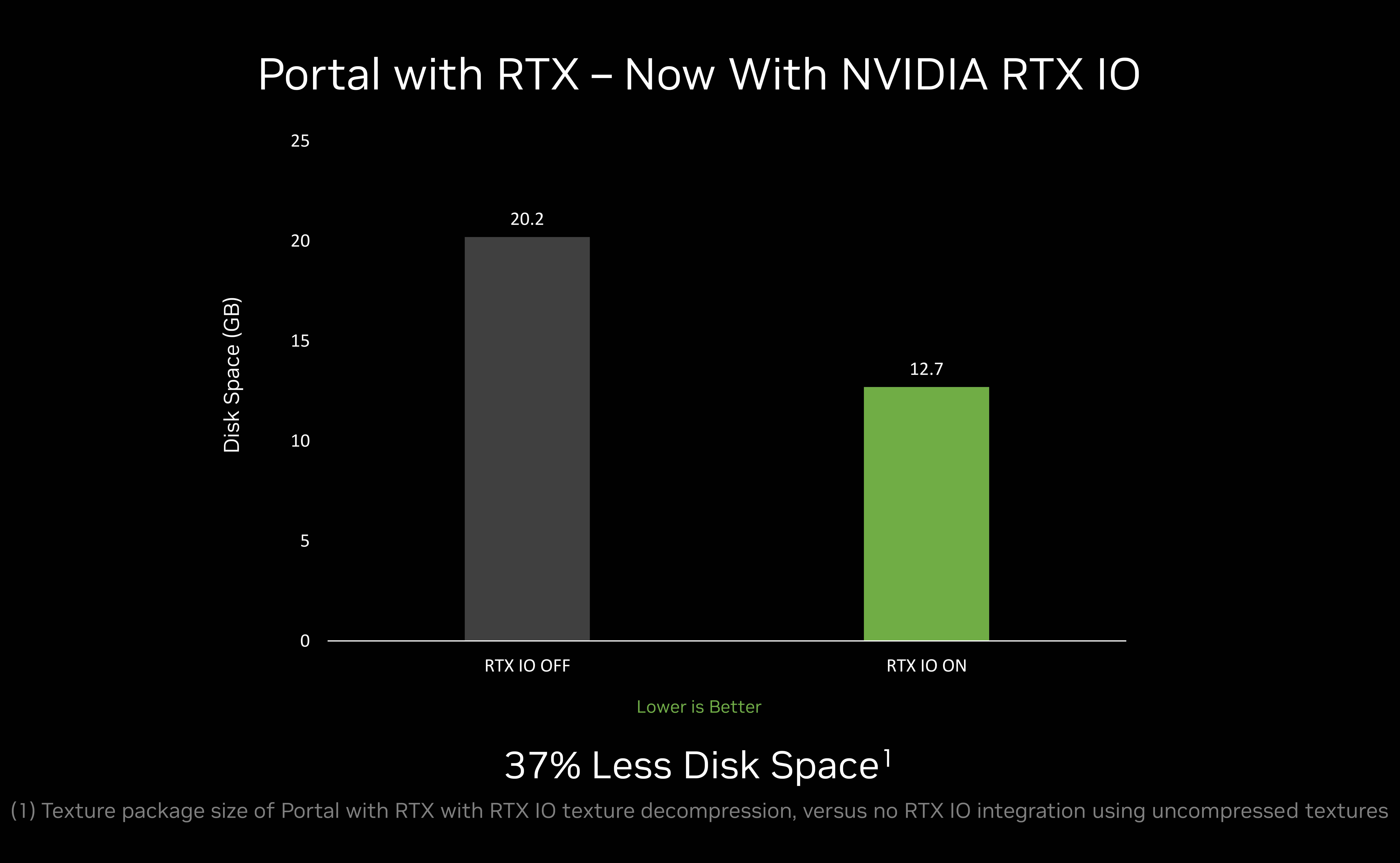 No Portal com RTX, o NVIDIA RTX IO reduz o tempo de carregamento de texturas em até 5X e reduz o espaço ocupado pela unidade de disco do jogo em 37%: